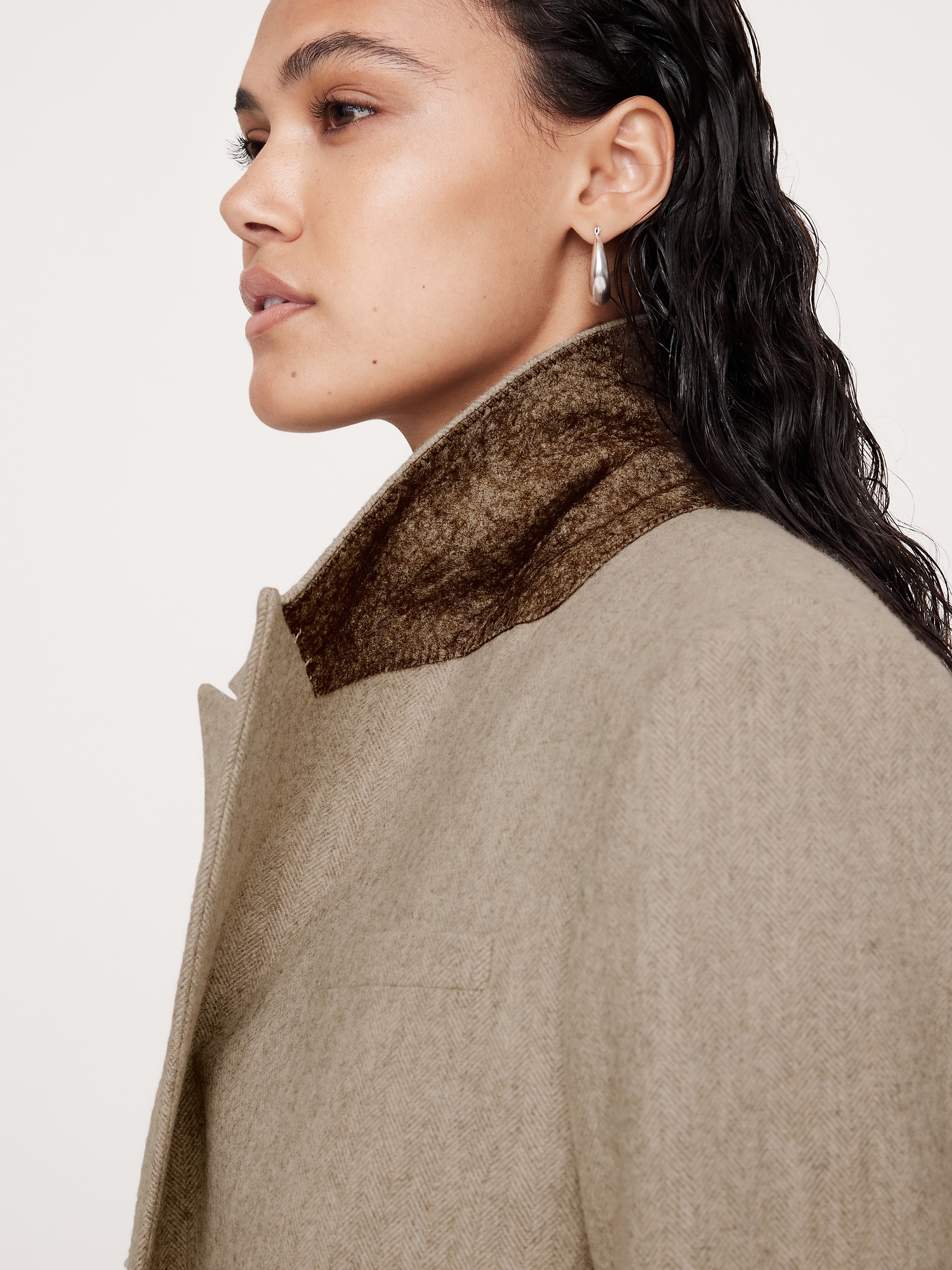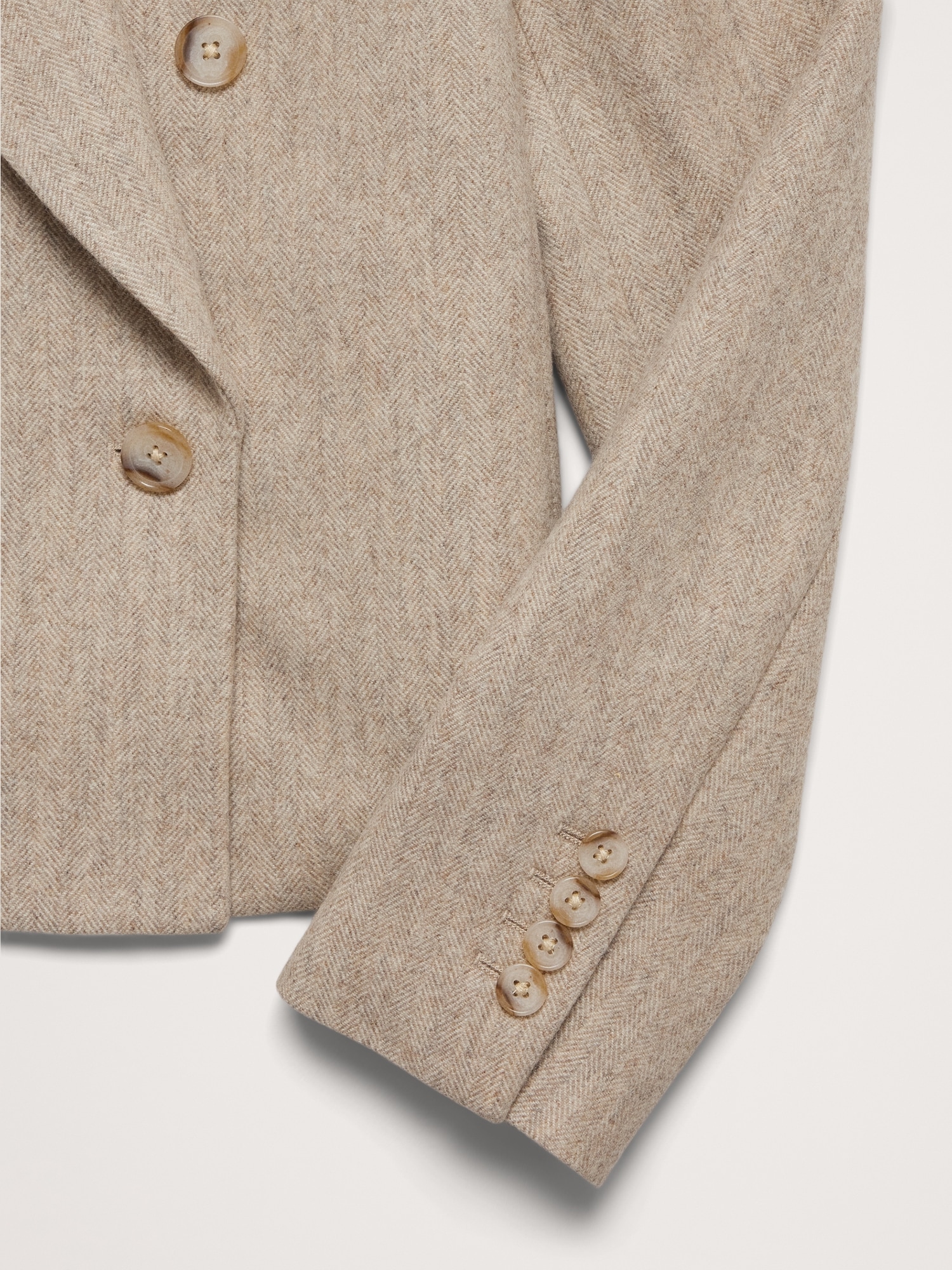 This double-breasted blazer is cut for a boxy, cropped fit with sharp shoulders. For fabric, we reached for a beautiful wool flannel fabric we love for its herringbone weave and its ability to carry you through cooler seasons.