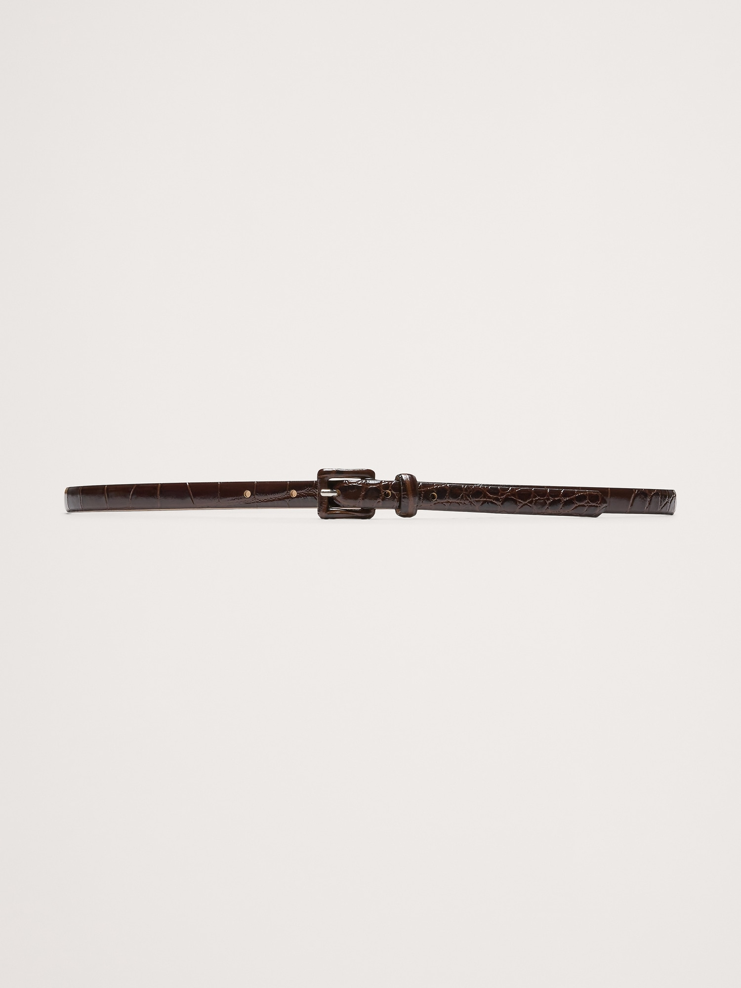 This skinny belt is designed to be worn at the hips and is made from leather embossed to mimic crocodile.