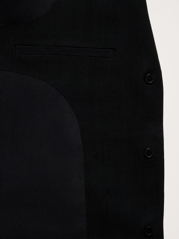 Notch lapel with three-button front.
