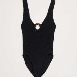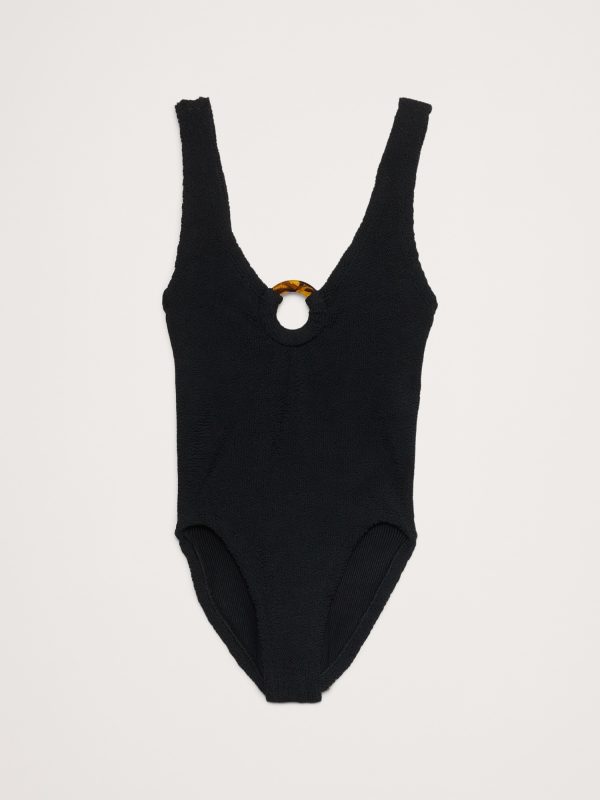 Modern swimsuit, timeless appeal. With tortoiseshell hoop detailing and a deep-v neckline, Celine has understated glamour down. Crafted in the brand’s signature Original Crinkle™ fabric, which offers a custom fit for US size 2-12.