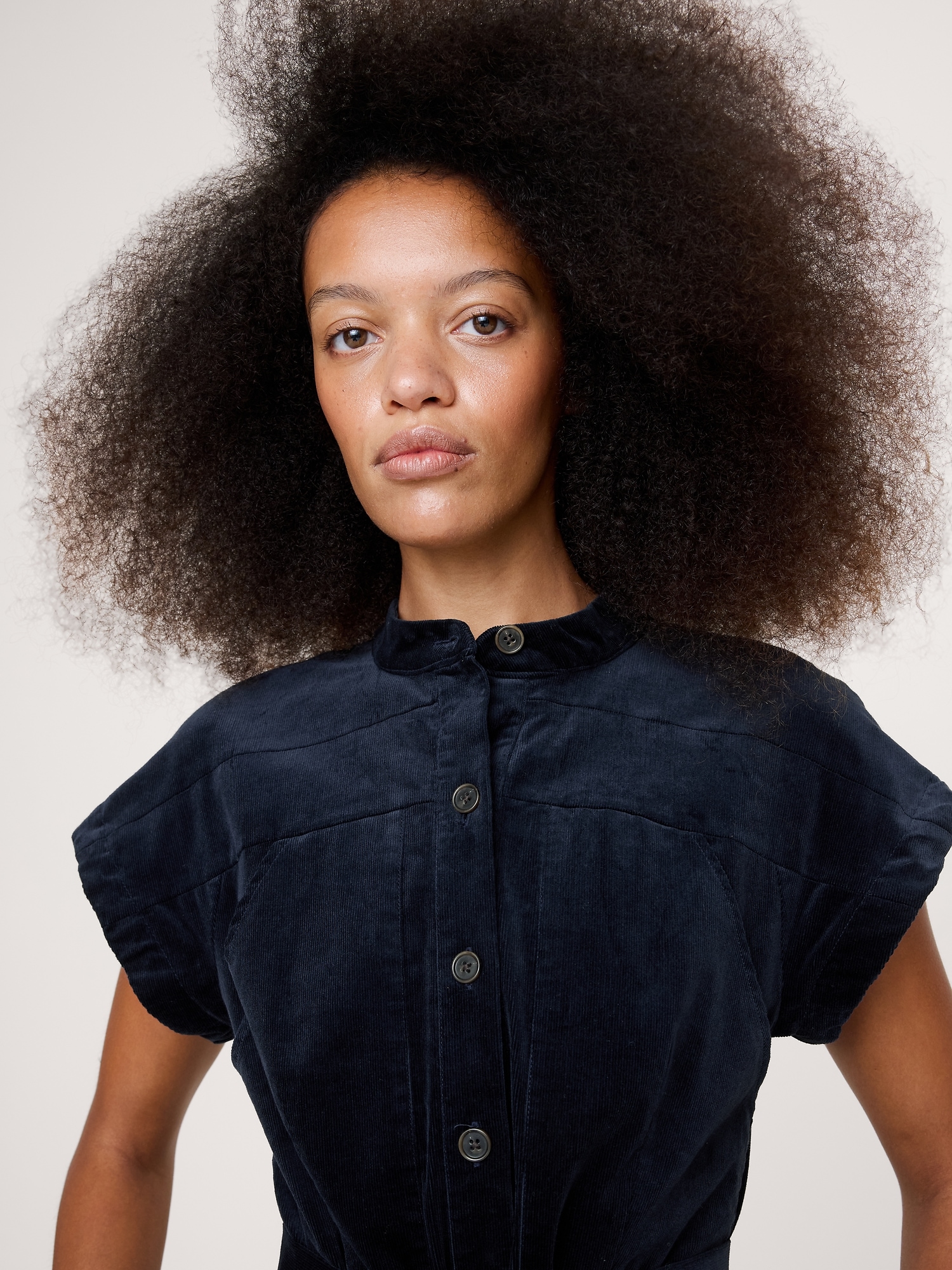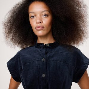 When it comes to a good shirt dress, no one does it quite like us. Here, we kept the silhouette clean with a banded collar—the better to show off this soft, fine-wale corduroy. Fit Flare: Fitted bust and waist with a flare skirt. Banded collar with button front. Belted waist. Front pockets. Side slits. Unlined. #817743