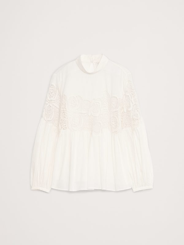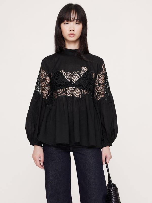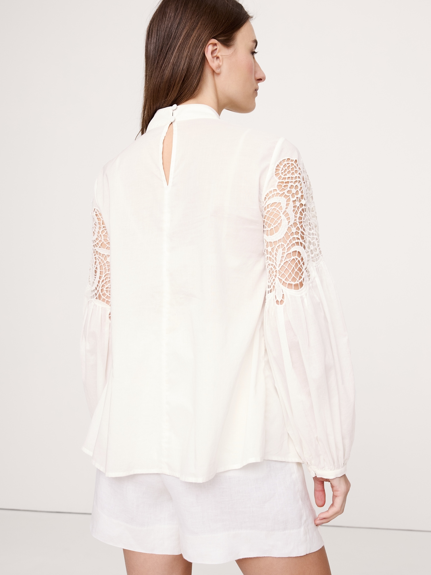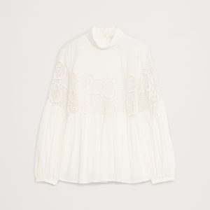 In your romantic era. This billowing top is cut from cotton lawn (so it’s lighter than poplin), with embroidered, cutwork lace accents.