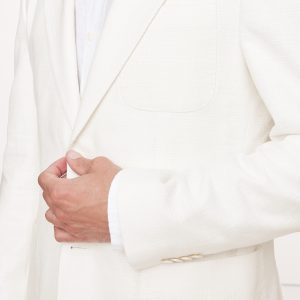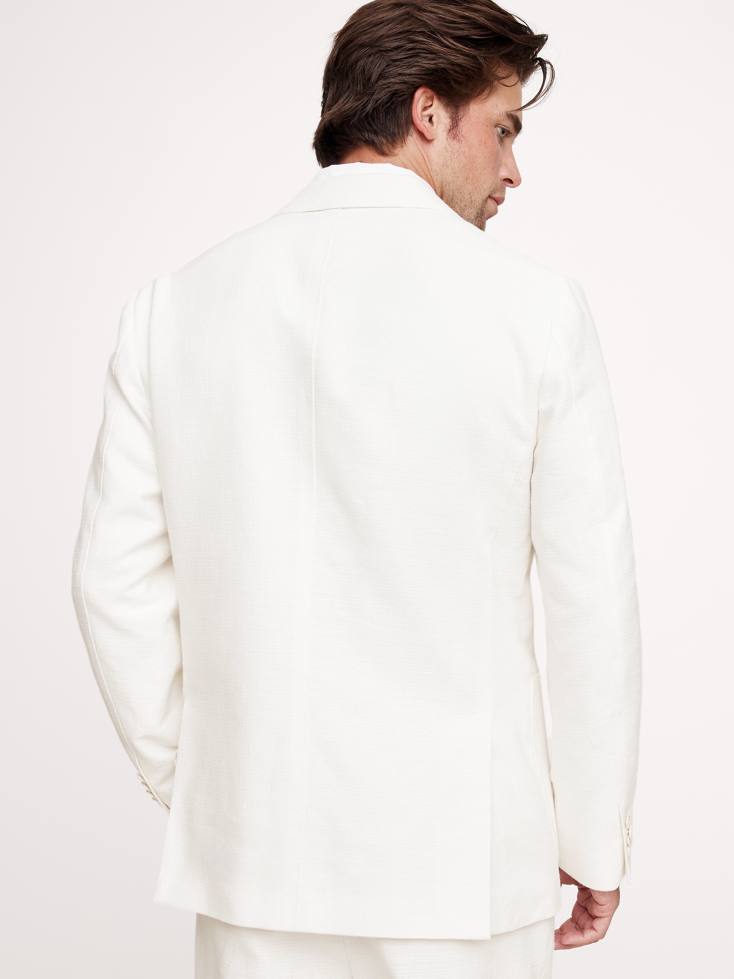Designed with warm climates in mind, this suit jacket is cut from a blend of linen, cotton, and viscose—seen here in a soft white. Wear it with the matching suit pant—hello, wedding season.