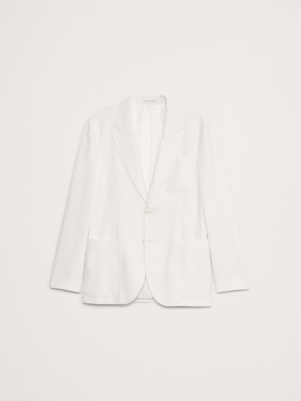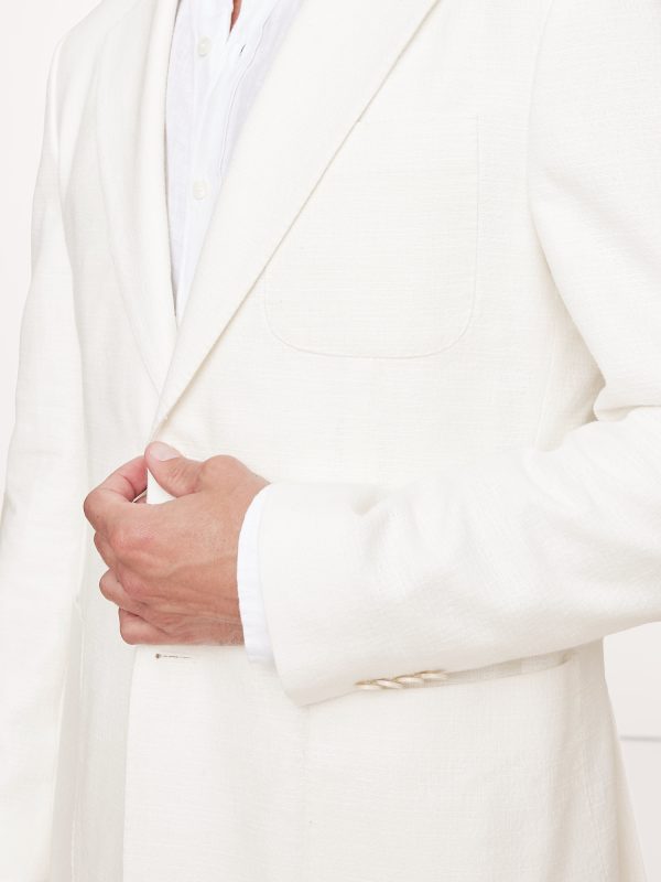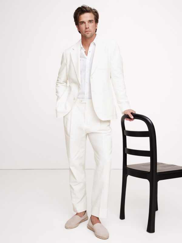 Designed with warm climates in mind, this suit jacket is cut from a blend of linen, cotton, and viscose—seen here in a soft white. Wear it with the matching suit pant—hello, wedding season.