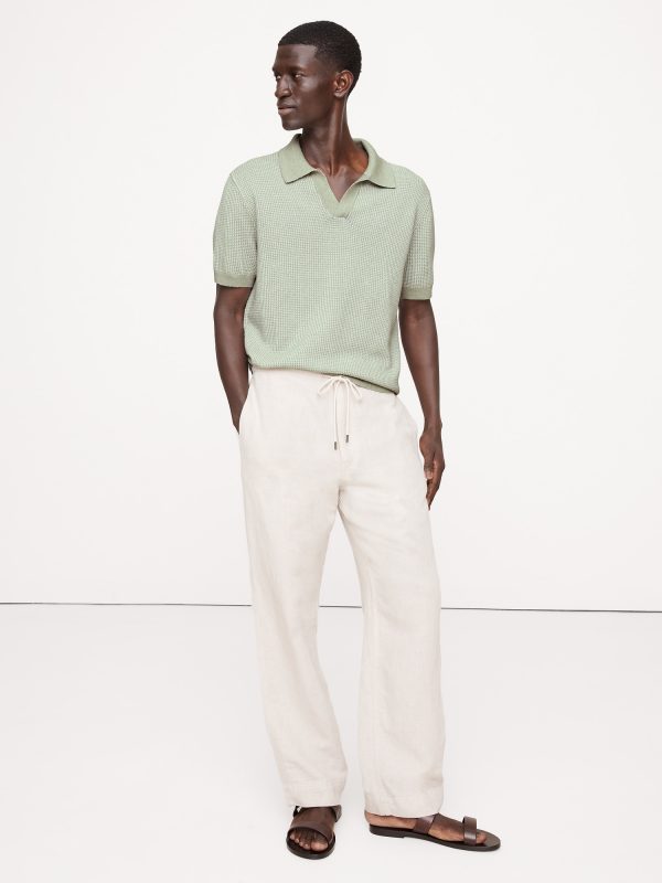 We love a retro sweater polo so we dreamed this one up in warm-weather ready cotton and linen. Look closely: it uses an intricate two-color jacquard stitch.