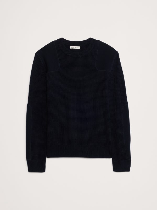 A utilitarian twist on the classic waffle-knit sweater, this one is knitted in soft cotton and warm Merino wool with patch details at the shoulders and arms.