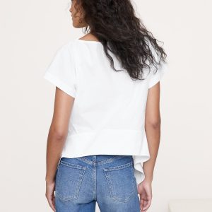 Deconstructed, reconstructed. This cotton poplin shirt borrows elements from the classic shirt, with a boatneck and asymmetrical hem twist. Let the bottom sash down or tie at the side to cinch the waist.