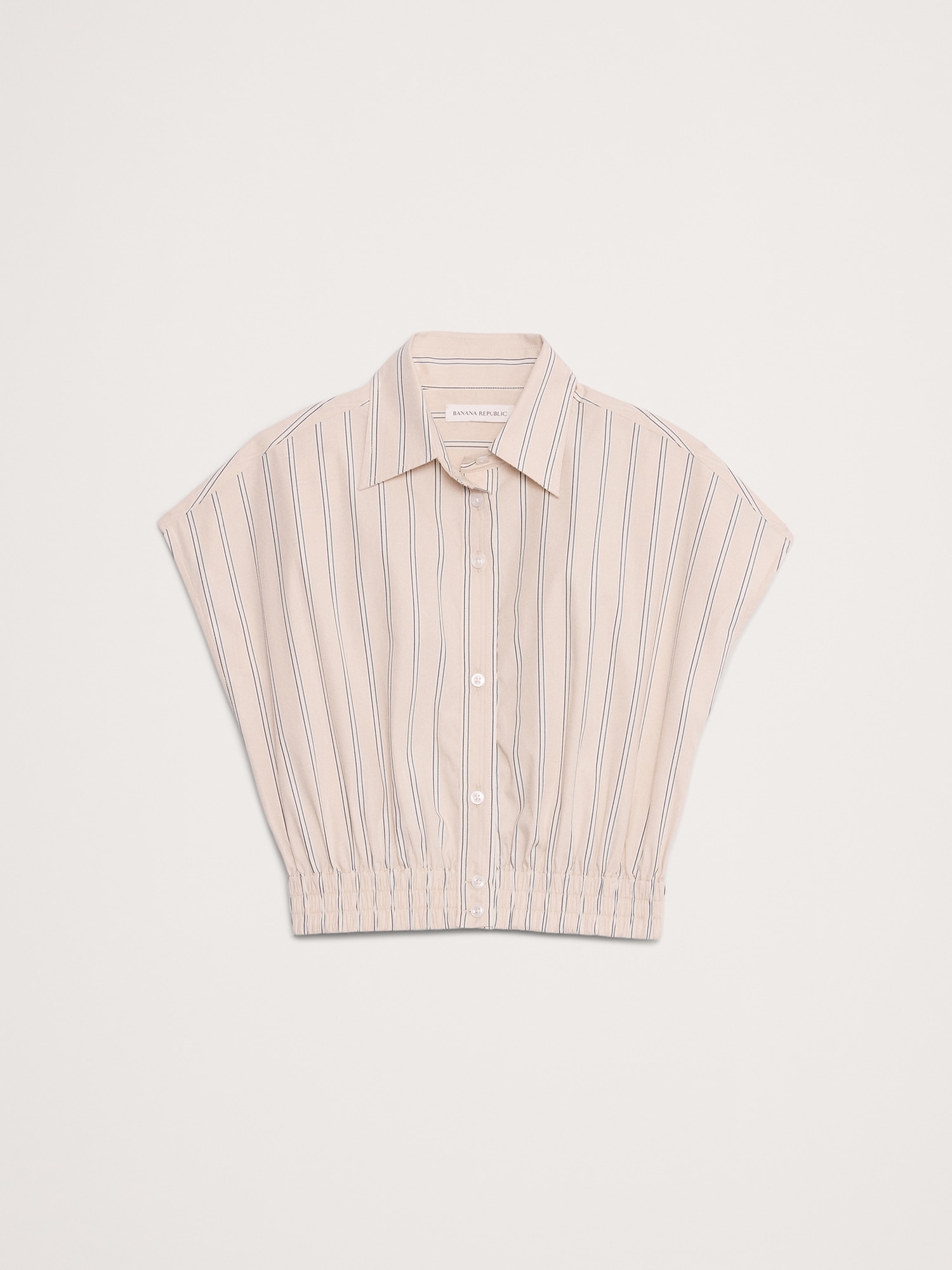 An invitation to play with proportions. This reimagined collared shirt has elastic at the hem and a tapered fit through the body that creates a sharp-shouldered silhouette.