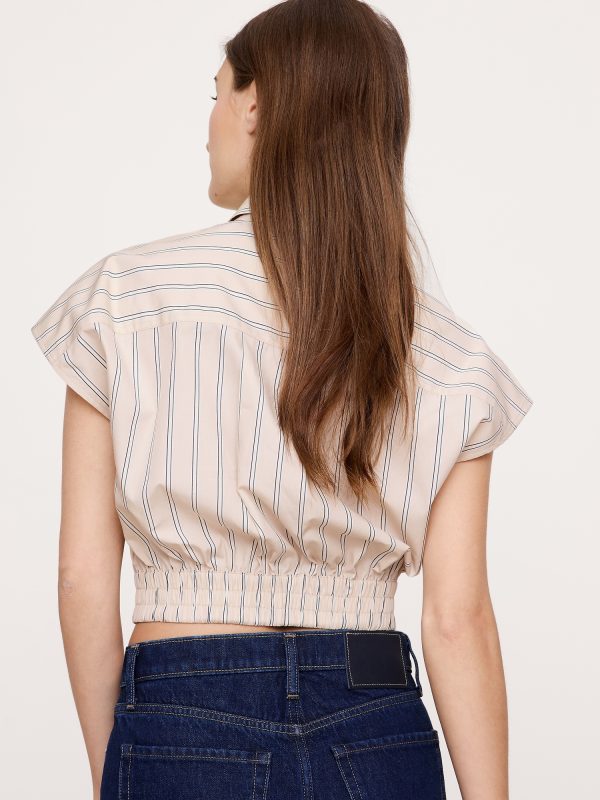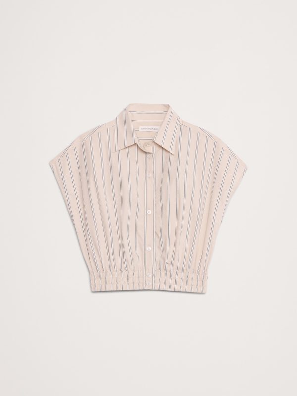 An invitation to play with proportions. This reimagined collared shirt has elastic at the hem and a tapered fit through the body that creates a sharp-shouldered silhouette.