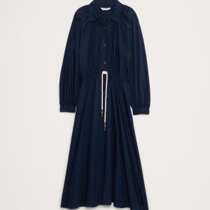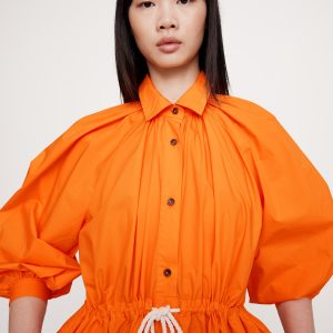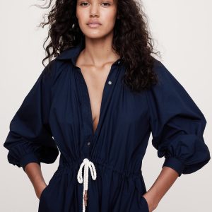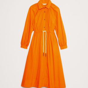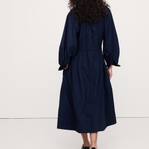 We’re loving cotton poplin right now (and always). This dress nods at the season’s volume-sleeve trend, fitted with shirtdress styling and a utilitarian drawstring at the waist.