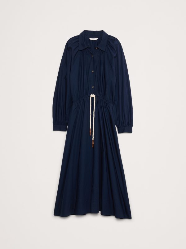We’re loving cotton poplin right now (and always). This dress nods at the season’s volume-sleeve trend, fitted with shirtdress styling and a utilitarian drawstring at the waist.