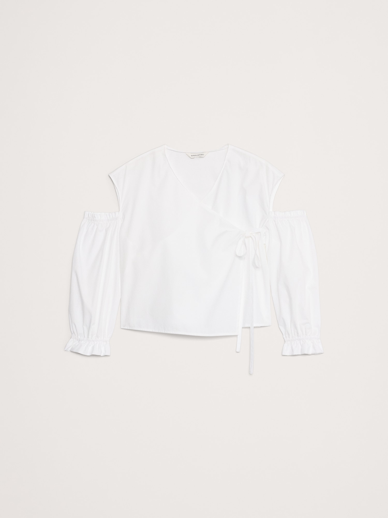 We cut this easy top with a wrap front and cut-out details—in our premium 100% cotton poplin. Relaxed fit: Relaxed fit through shoulders, chest and waist. V-neck with tie front closure. Elastic cuffs. Unlined. #770274