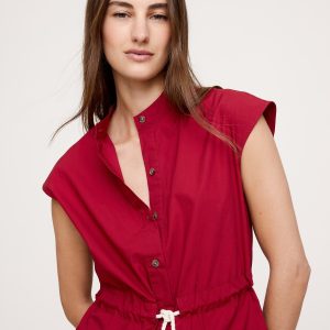 We’re loving cotton poplin right now (and always). This romper nods at the season’s utility trend with a rope-like drawstring at the waist and banded collar.