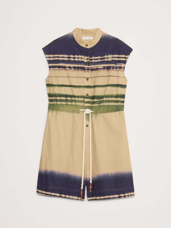 We’re loving cotton poplin right now (and always). This romper nods at the season’s utility trend with a rope-like drawstring at the waist and banded collar.