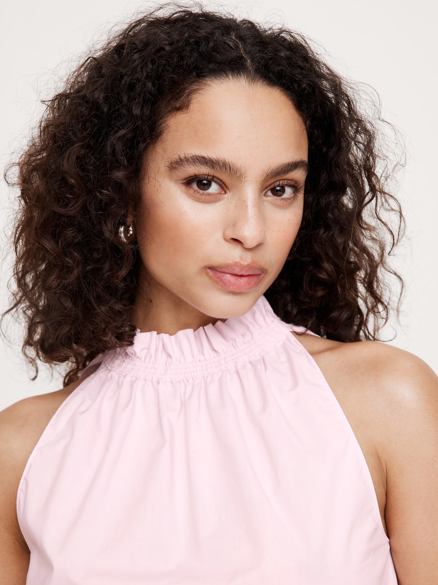 We love poplin because it transcends trends. Here, a ruffle-neck top in premium 100% cotton poplin. Pair with the matching smocked maxi skirt to make it a set.