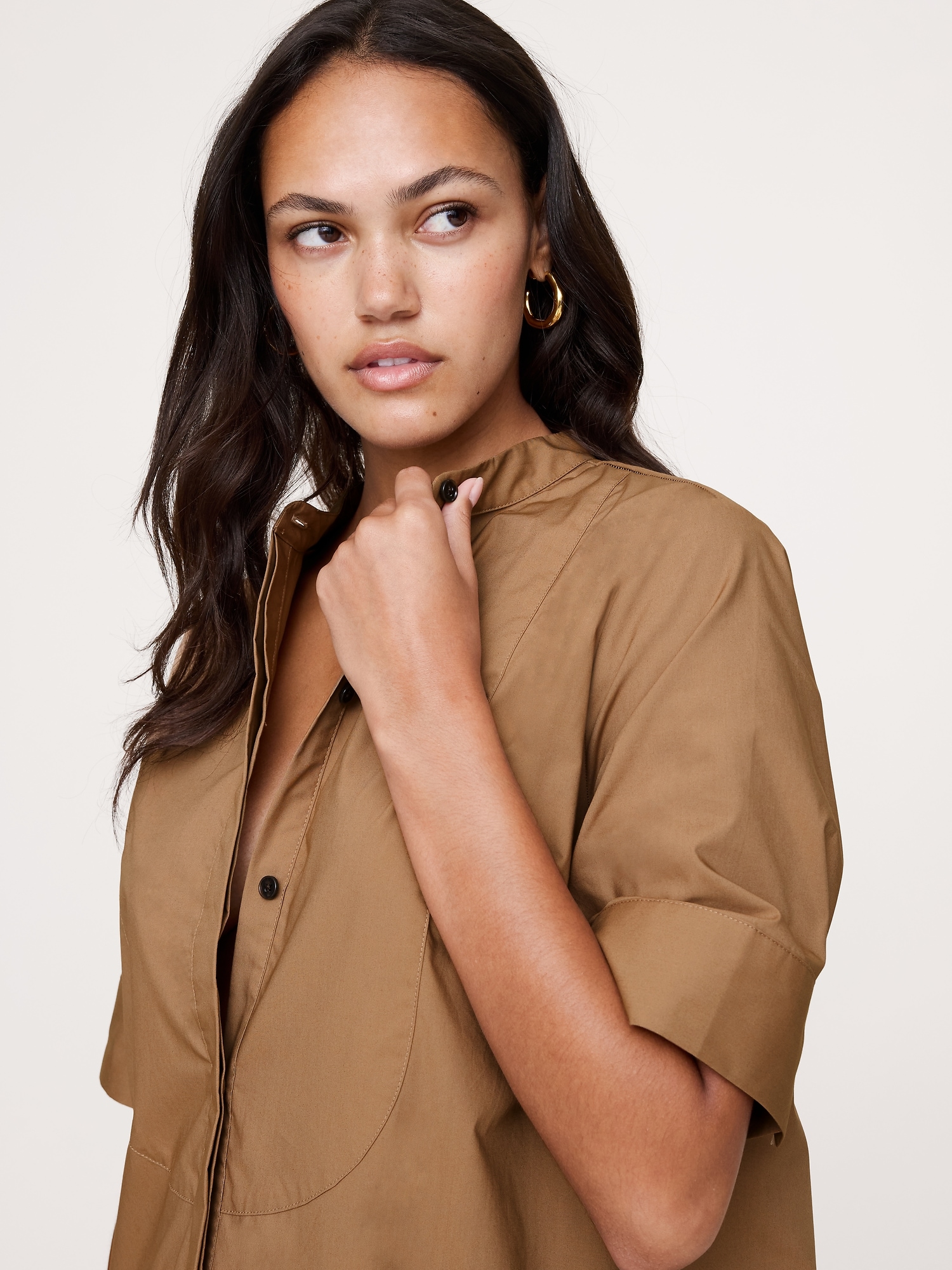 Bring on the sunshine. This is a relaxed shirt dress with a tuxedo-style front panel detail at the bodice, a tiered skirt, and an extra wide hem to add a little flounce.
