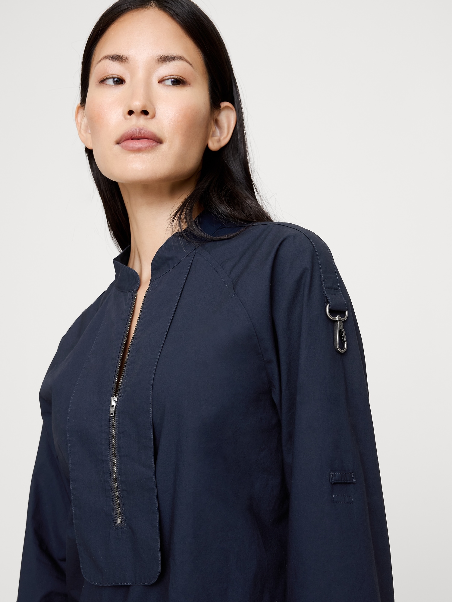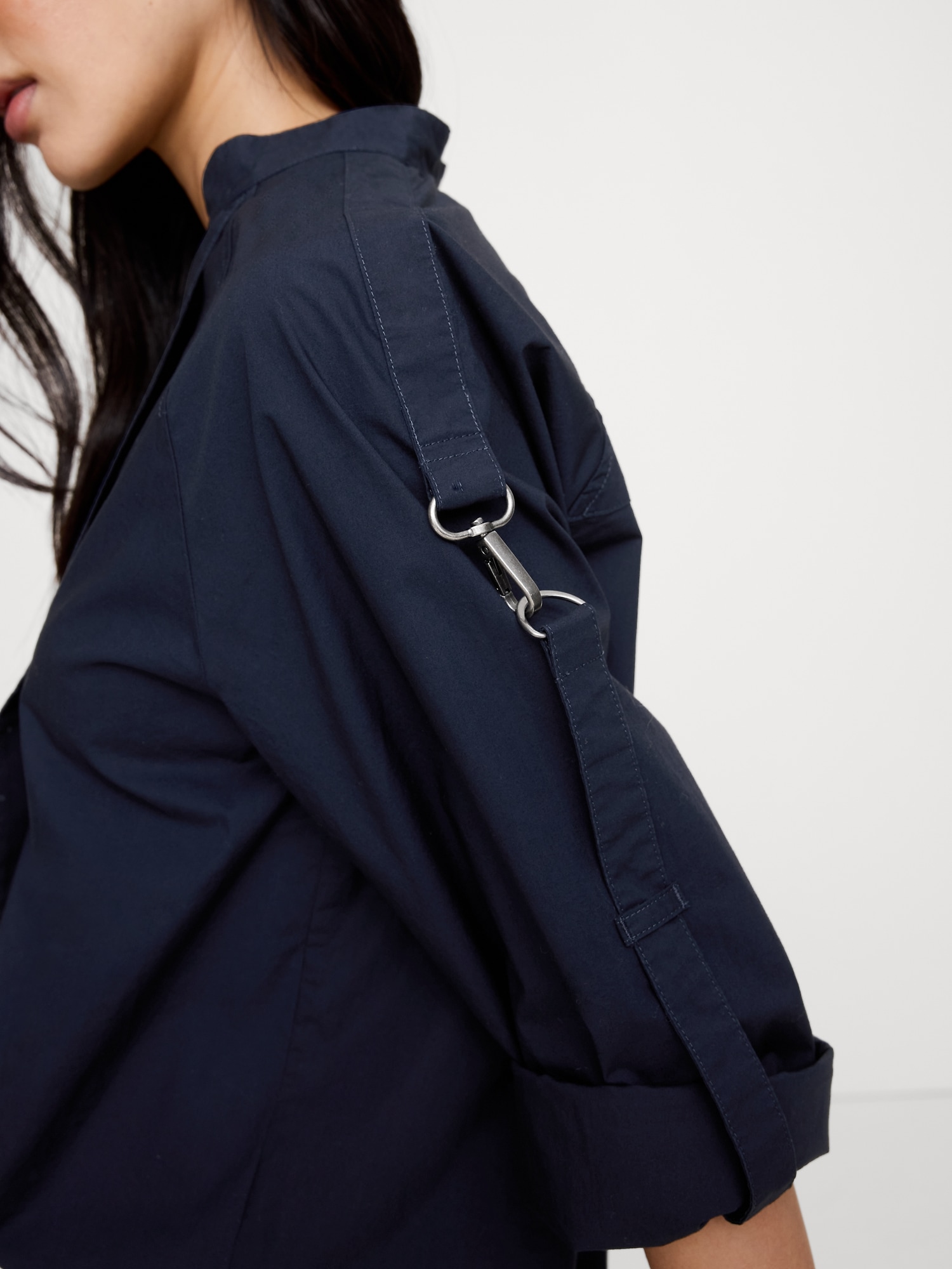 A classic popover, with a utilitarian twist thanks to a zip-front placket, banded collar, and roll-tab sleeves with clip hardware—in our 100% cotton poplin. Relaxed fit: Relaxed fit through shoulders, chest and waist. Banded collar with zip front. Roll-tab sleeves. Straight hem. Unlined. #826091