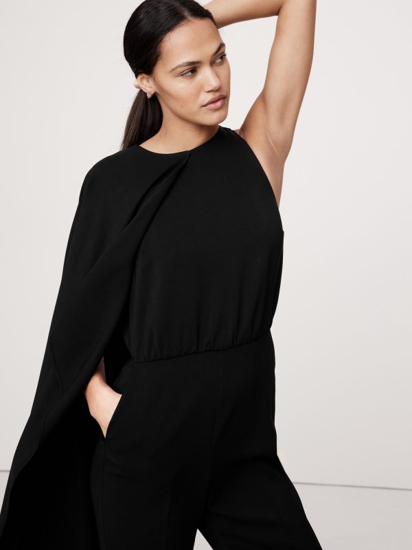 Your sign to RSVP yes. Crafted from a matte crepe fabric with cape shoulder detail, this jumpsuit has a slim fit through the hips with a slim, tapered leg.
