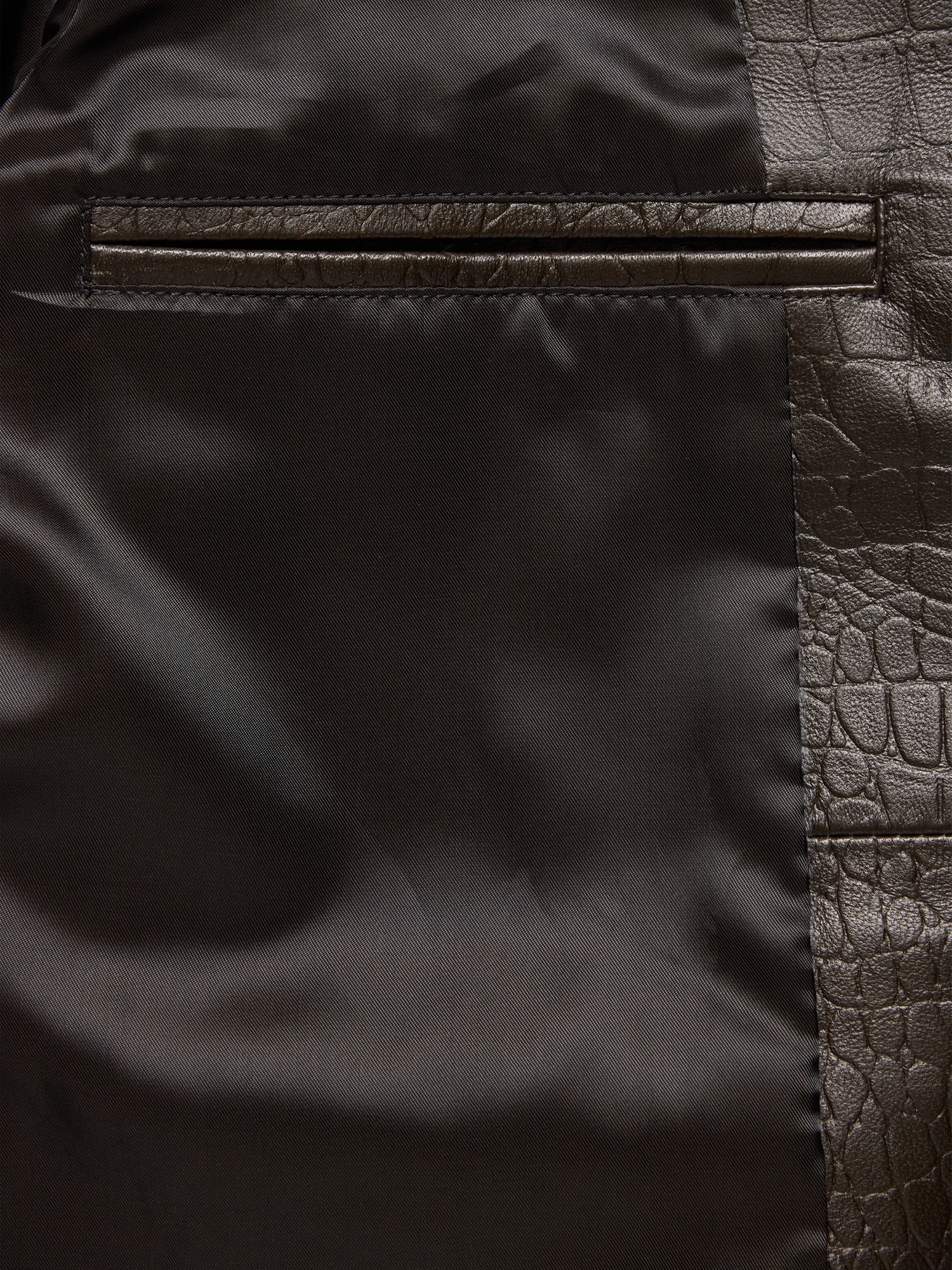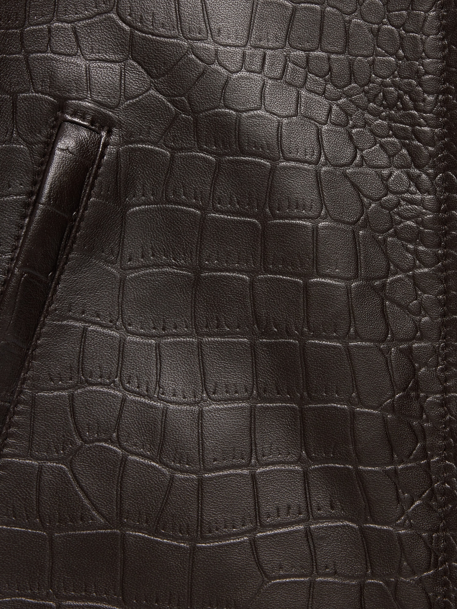 Look closely: this sleek leather jacket is cut from a luxurious leather quality that has been embossed to mimic the look and feel of crocodile. Here, we showcase this beautiful material in a classic, minimalist silhouette with a two-way zip front and point collar to give this style the retro, utilitarian vibe of a garage jacket.