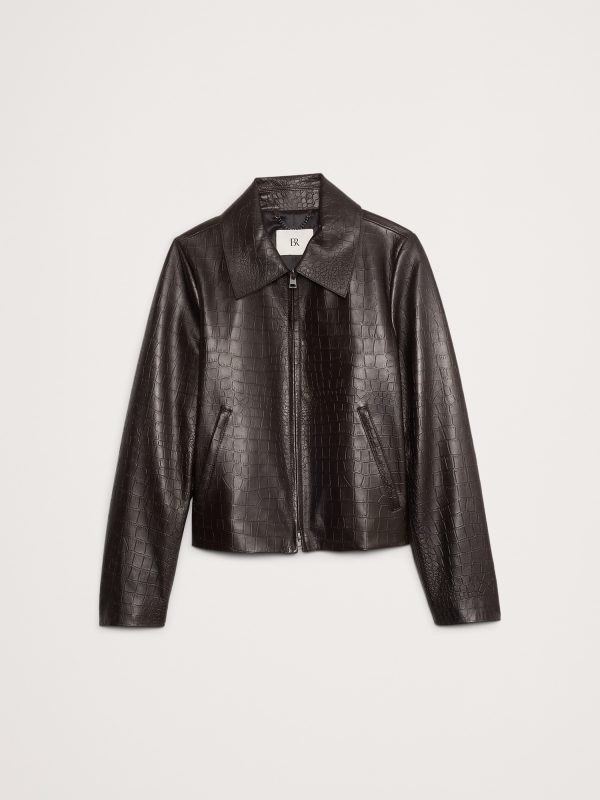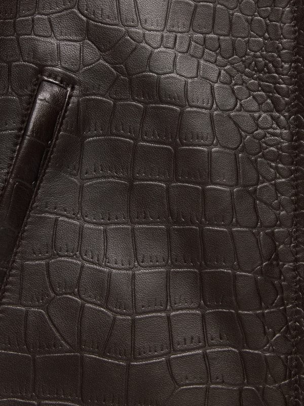 Look closely: this sleek leather jacket is cut from a luxurious leather quality that has been embossed to mimic the look and feel of crocodile. Here, we showcase this beautiful material in a classic, minimalist silhouette with a two-way zip front and point collar to give this style the retro, utilitarian vibe of a garage jacket.