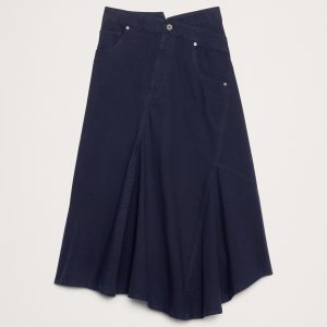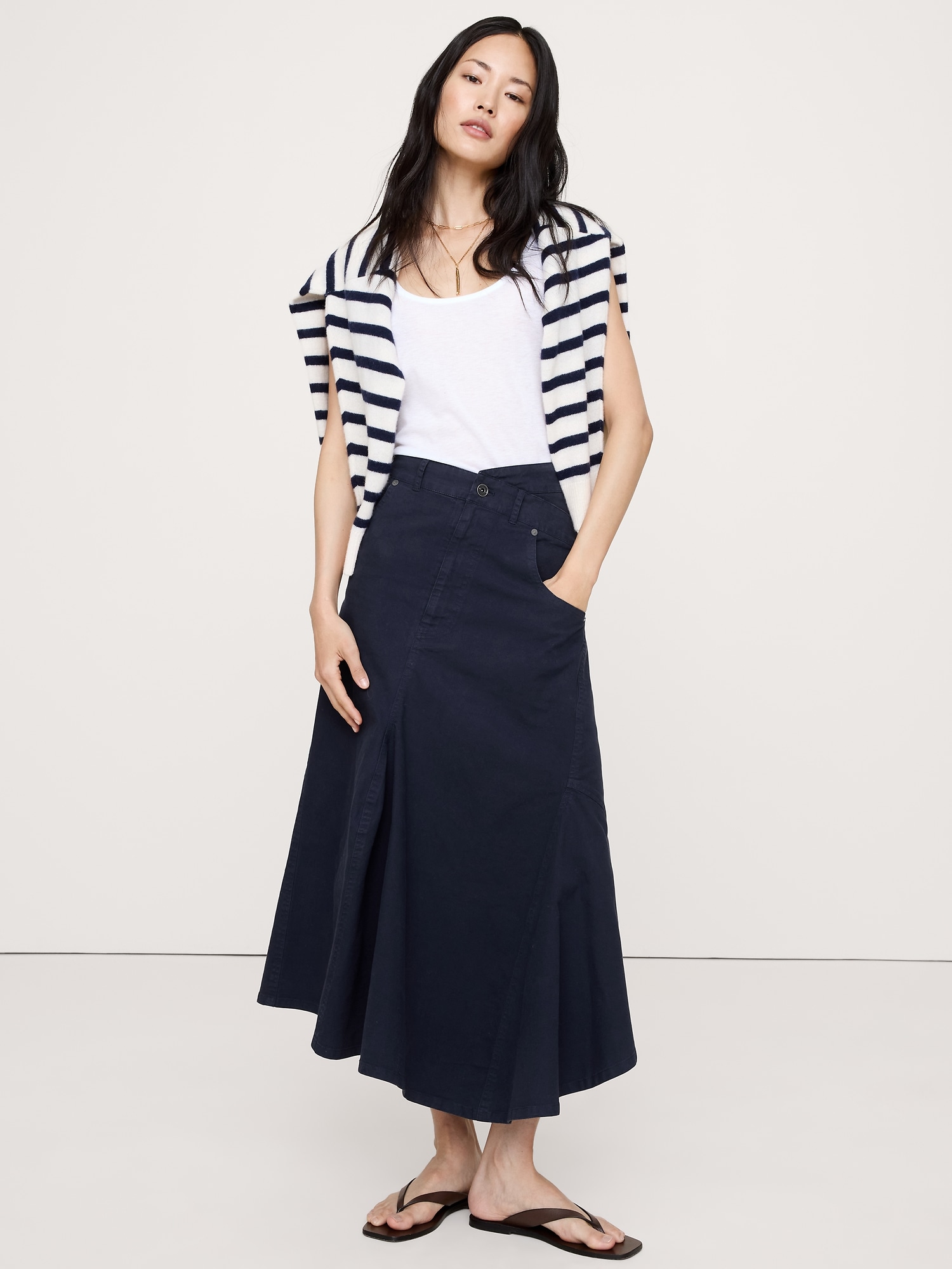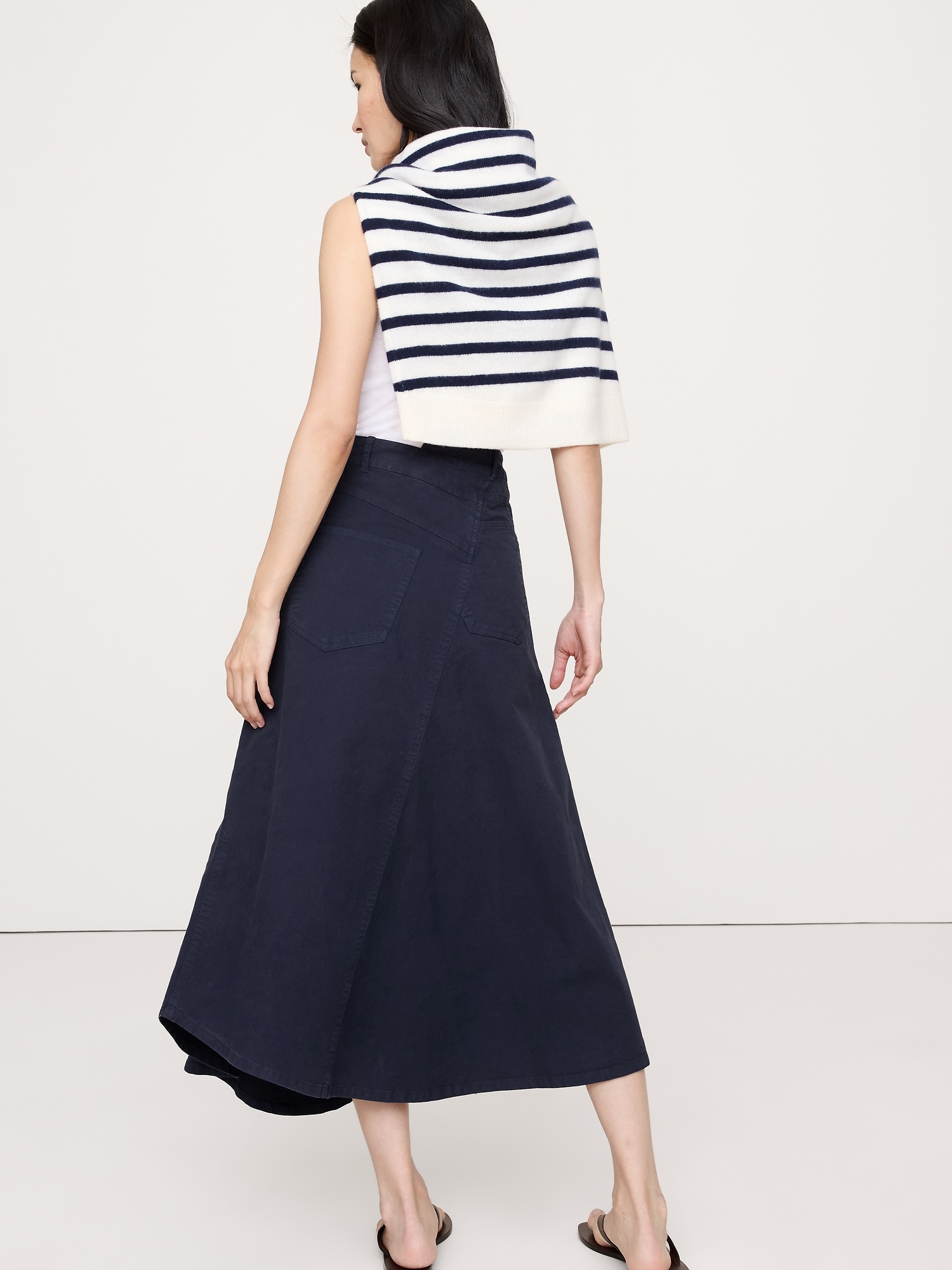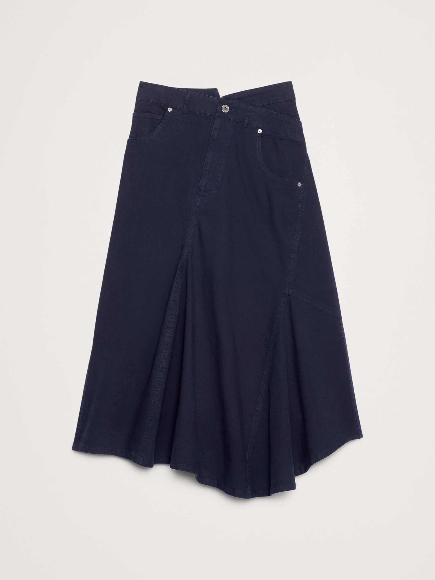 Deconstructed, reconstructed. We borrowed the five-pocket styling of your fave pair of jeans for a twisted midi skirt with crossover waistband. Cut in a soft-but-sturdy cotton canvas and finished with a garment wash for softness and lived-in color.