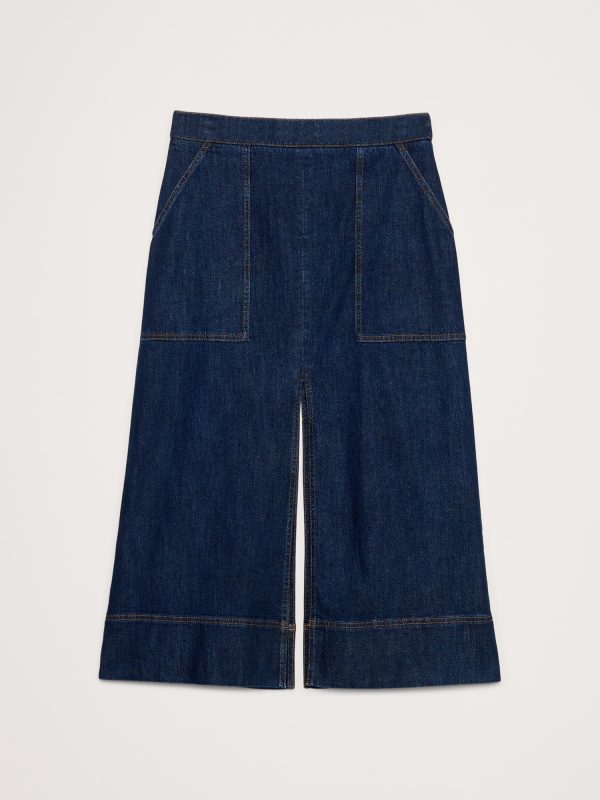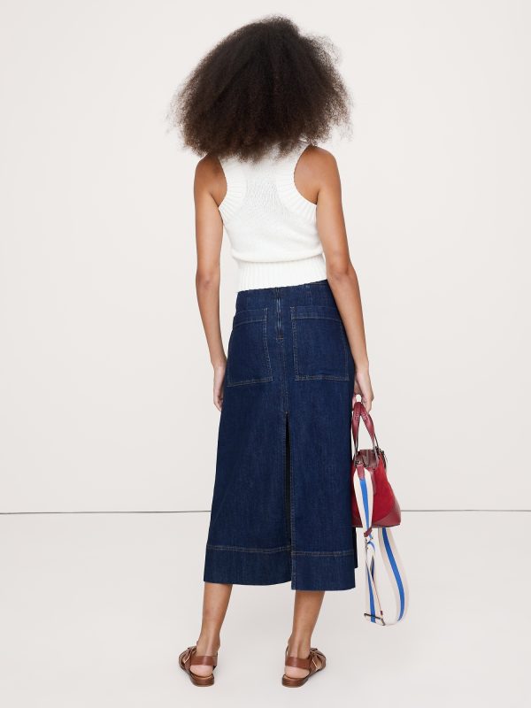 A sleek denim midi skirt. We cut this midi skirt in a soft, stretchy denim with patch pockets and slits at front and back for an at-ease look.
