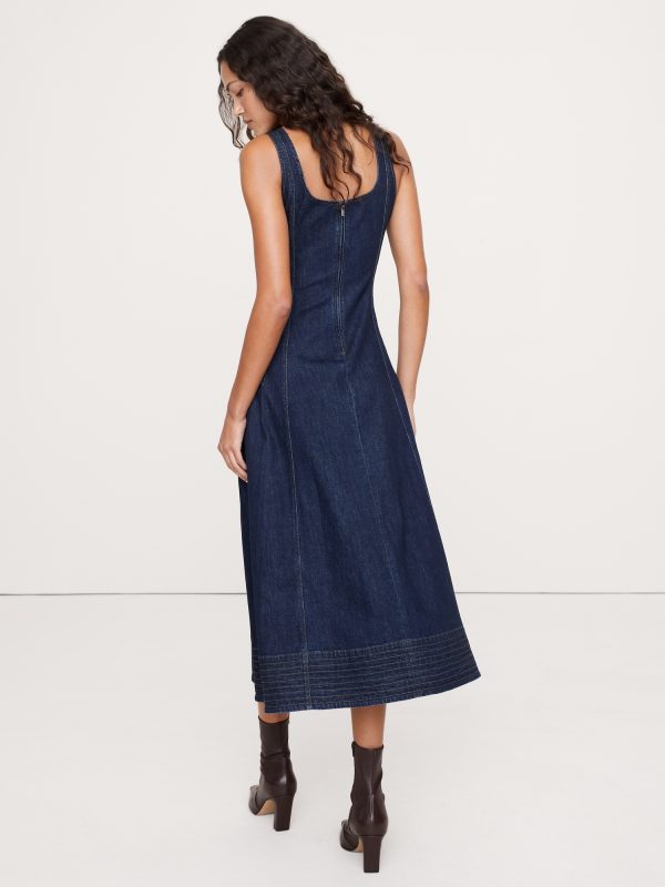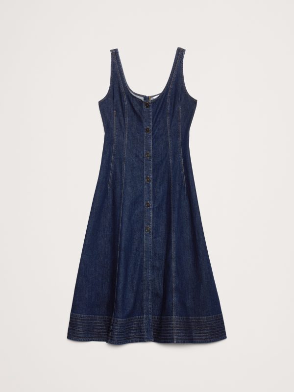 The actually-comfortable corset dress. We cut this midi dress with princess seams using body-hugging stretch denim for extra shaping and comfort. Fit Flare: Fitted bust and waist with a flare skirt. Scoop neck. Zip-back closure with button-front detail. Unlined. #859429