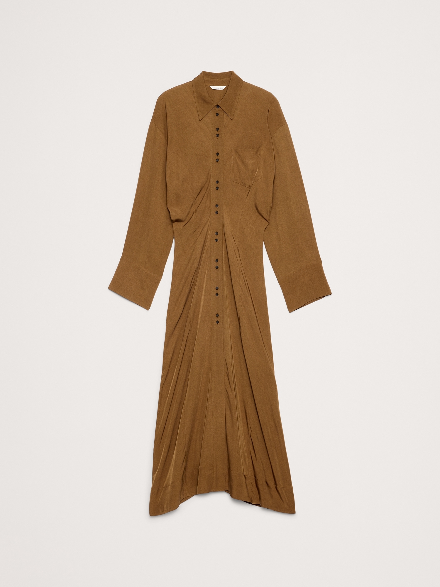 We love a shirt dress because you can wear them basically everywhere. Here, we kept the fit easy through the shoulders and chest, but defined the waist. Cut in our drapey twill so it’s a bit more dressed up.