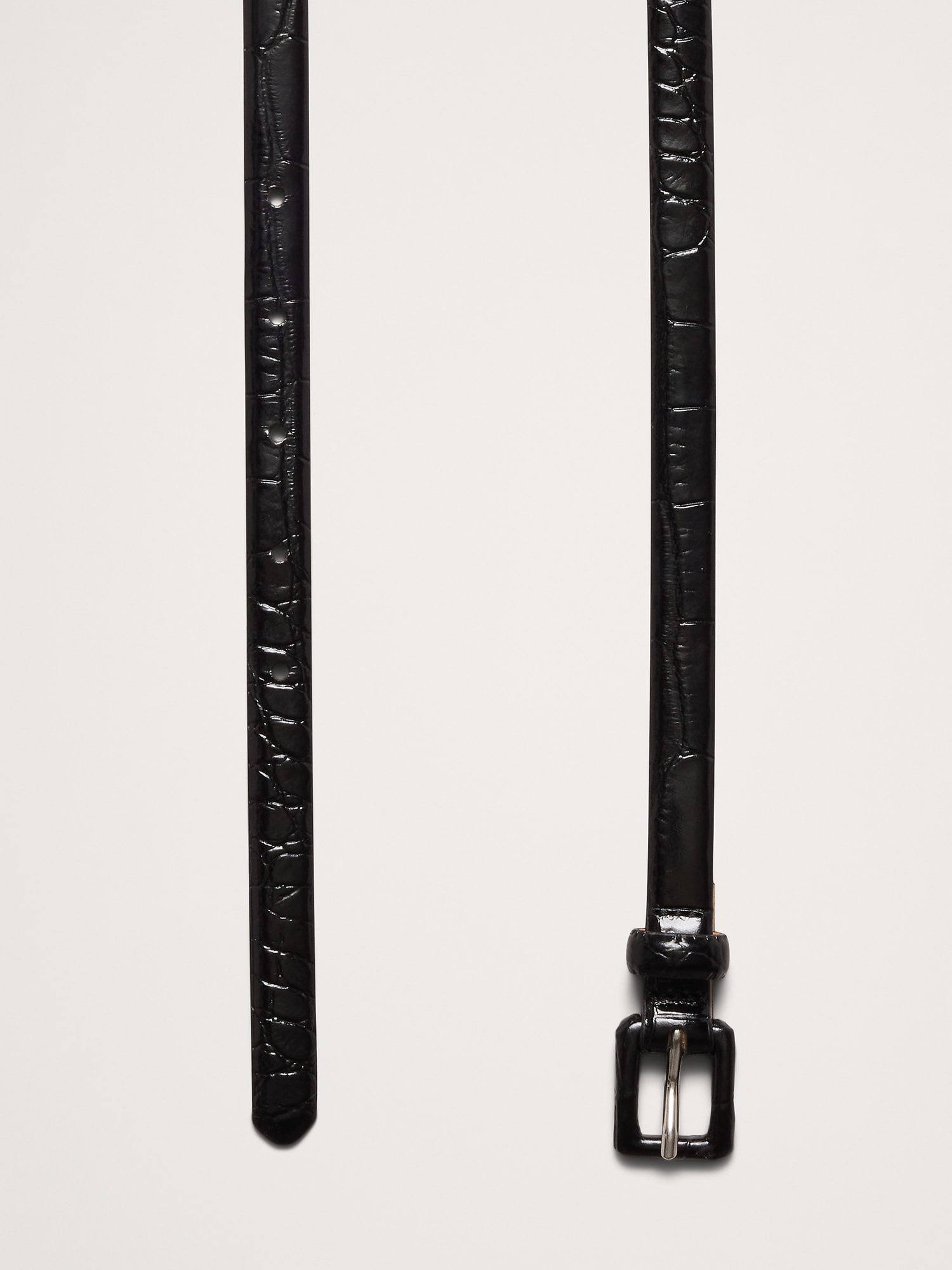 This skinny belt is designed to be worn at the hips and is made from leather embossed to mimic crocodile.