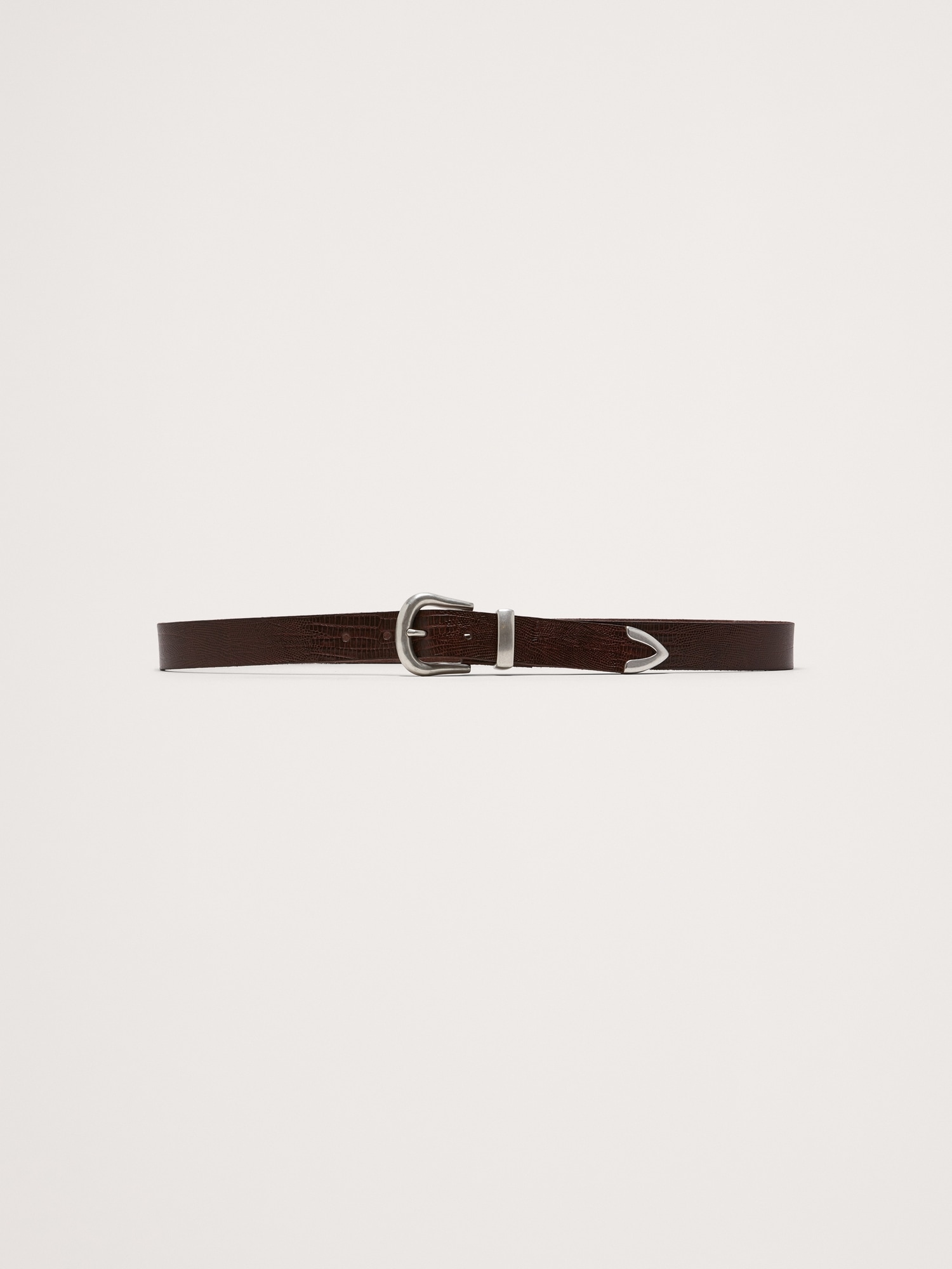 Inspired by a vintage piece, we reached for an embossed leather that mimics the look of lizard. Here, we added a Western-style buckle and a metal tip detail.