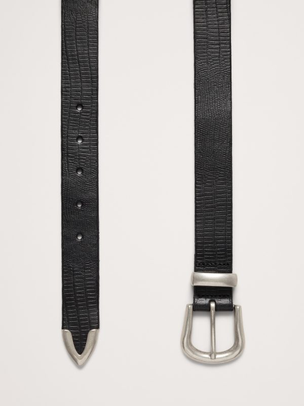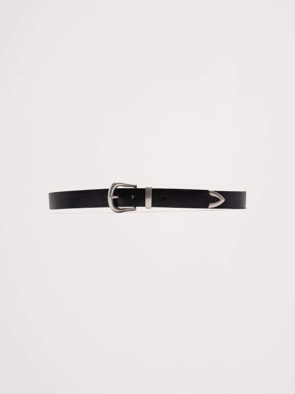 Inspired by a vintage piece, we reached for an embossed leather that mimics the look of lizard. Here, we added a Western-style buckle and a metal tip detail.