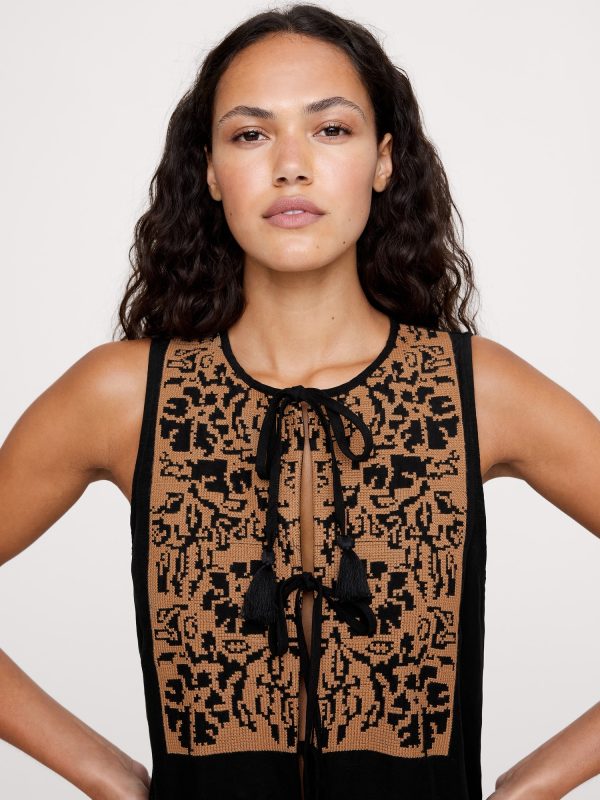 Crew neck with tie-front closures.