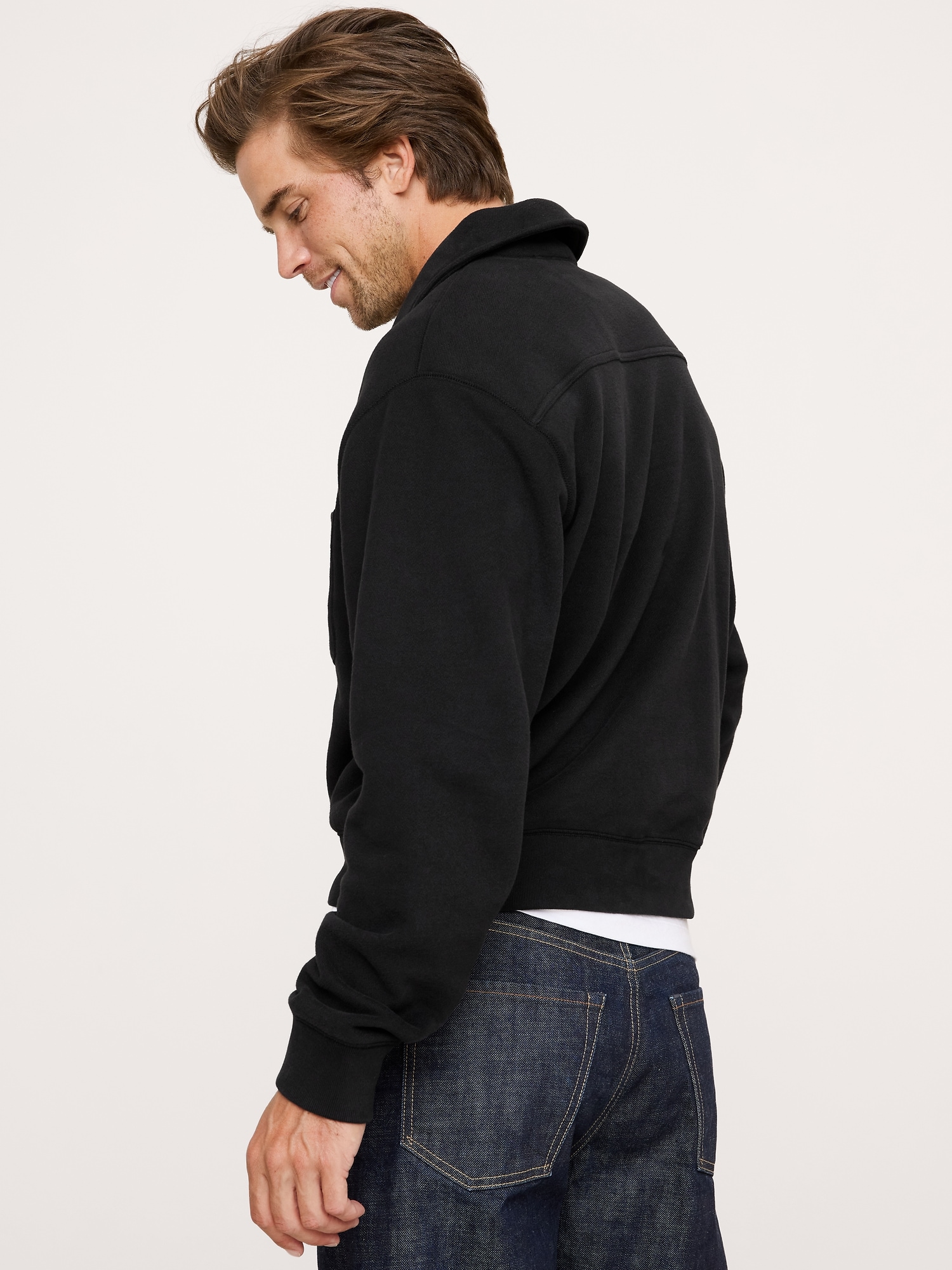 Team Cozy. We reached for one of our softest sweatshirt fleeces here, opting for a boxy, relaxed fit and zip-placket polo collar for a vintage vibe.