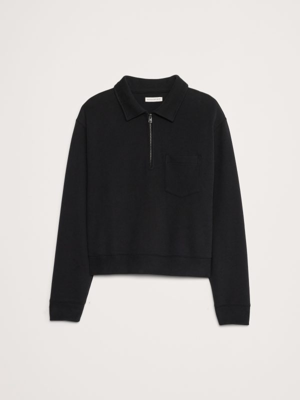 Team Cozy. We reached for one of our softest sweatshirt fleeces here, opting for a boxy, relaxed fit and zip-placket polo collar for a vintage vibe.