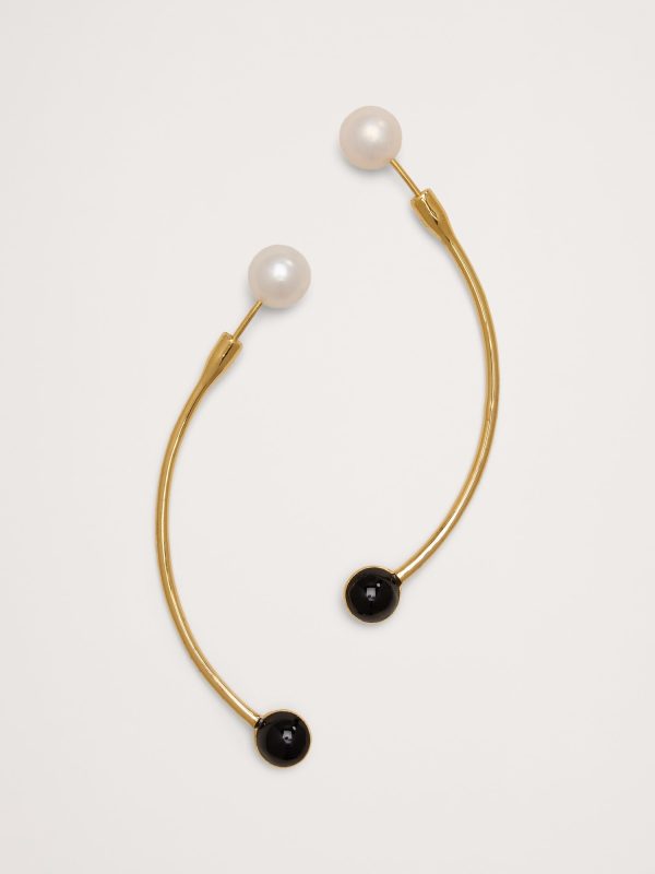 Balanced barbell earrings with freshwater pearl and resin stone accents, in 14-karat gold plated brass. Can we worn with the pearl facing forward or back.