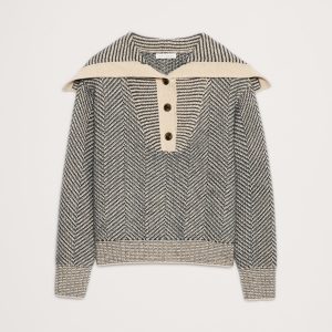 Everything about this sweater is the oversized fit, a dramatic sailor collar, and the intricate herringbone jacquard pattern. It’s knit from yarns spun from some of our cold-weather favorites: Merino wool, cotton, and luxe alpaca.