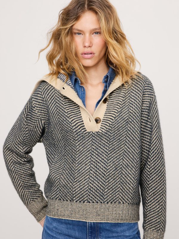 Everything about this sweater is the oversized fit, a dramatic sailor collar, and the intricate herringbone jacquard pattern. It’s knit from yarns spun from some of our cold-weather favorites: Merino wool, cotton, and luxe alpaca.