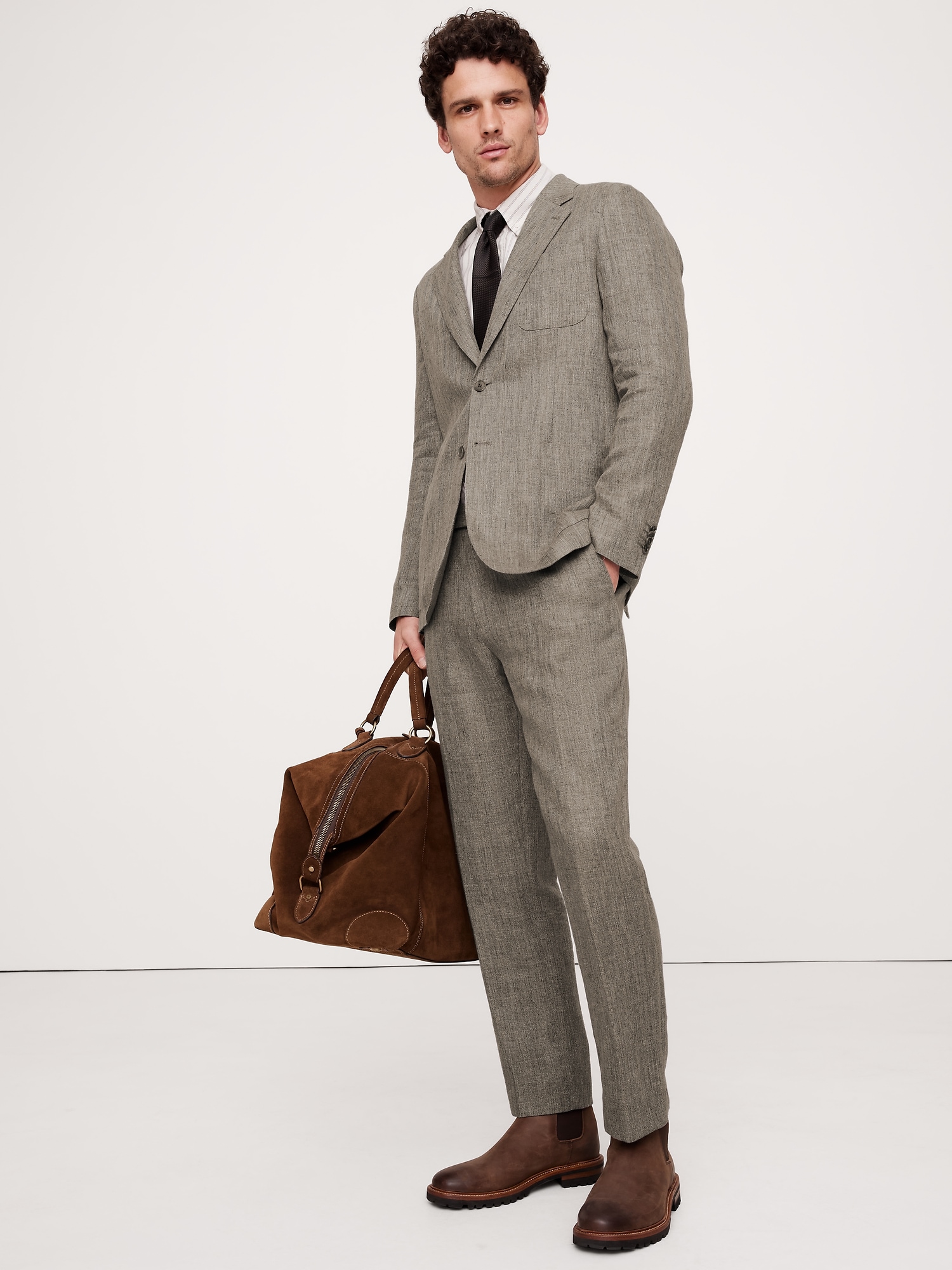 We cut this suit jacket with warm weather in mind, picking a beautiful, certified-European linen fabric and leaving the back unlined so it stays cool even when things heat up. Look closely: we love this fabric’s traditional herringbone weave and variegated taupe color.