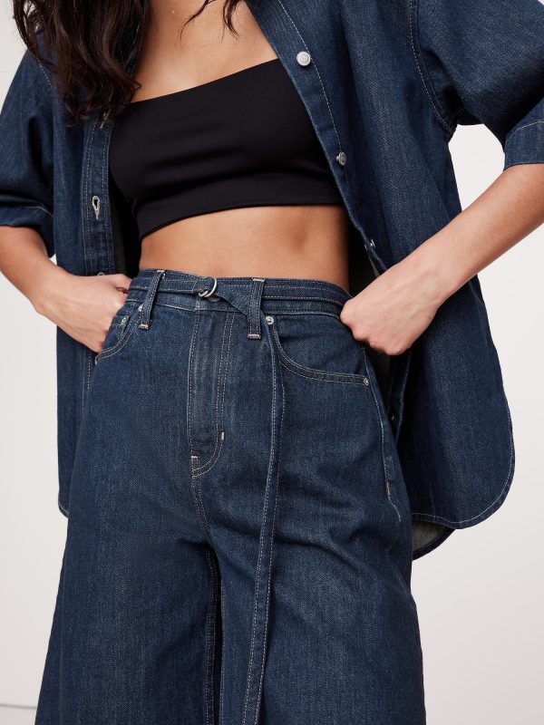 High rise (12\”). Fitted waist, relaxed through the hip and thigh with a wide leg.