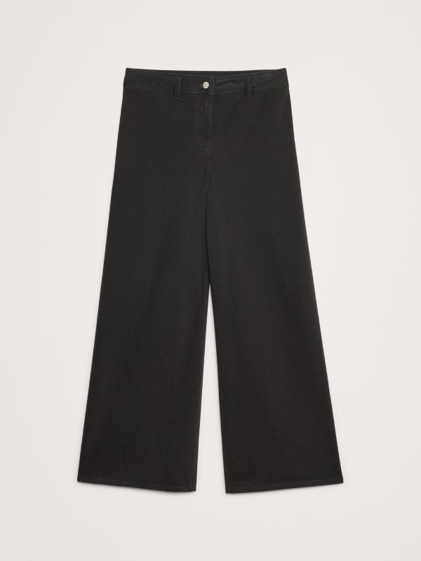 Wide leg: High rise. Fitted waist and hip, with a straight leg. Ankle length.