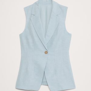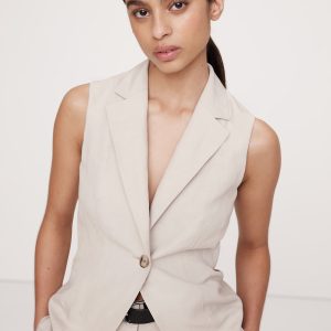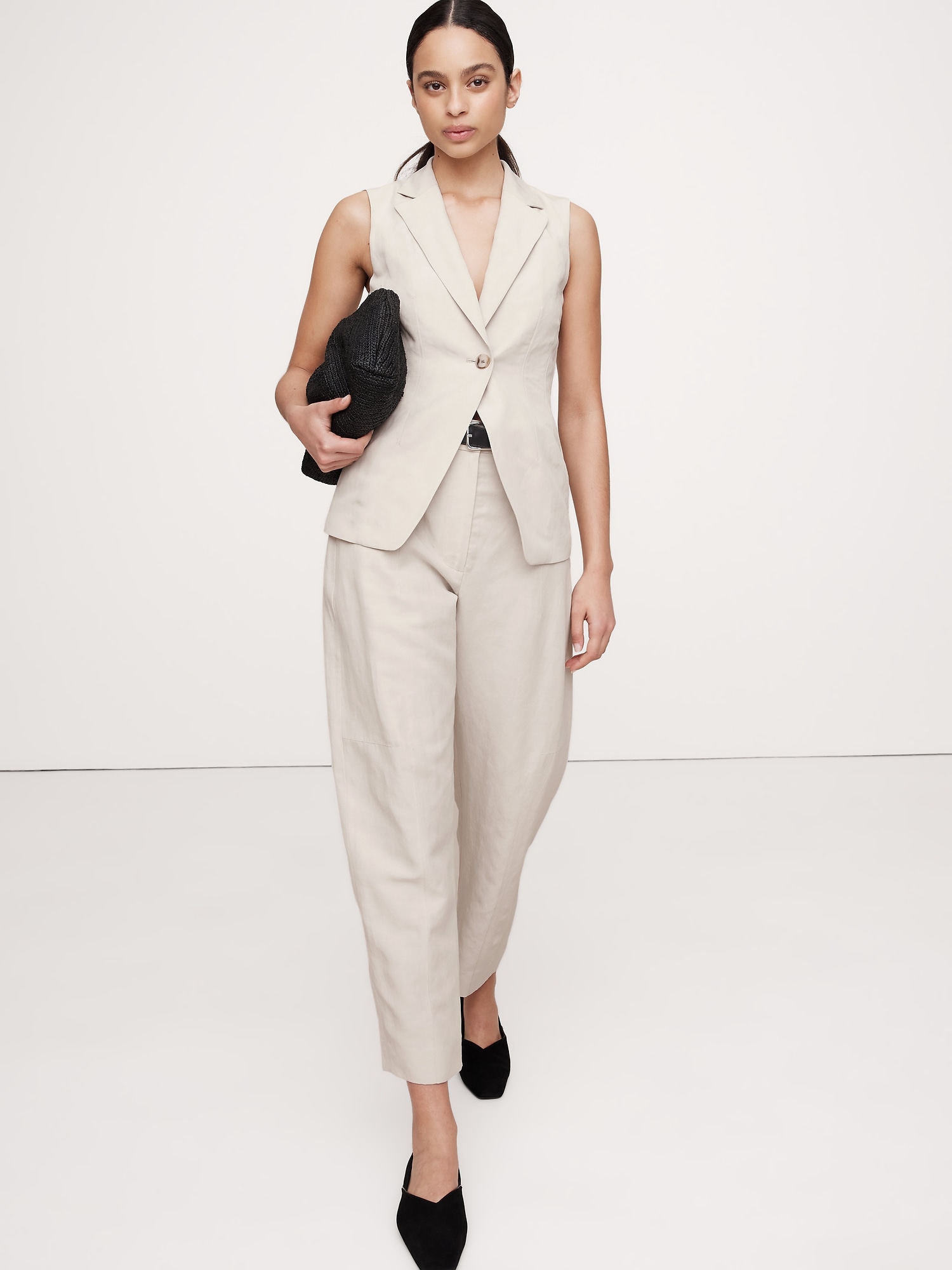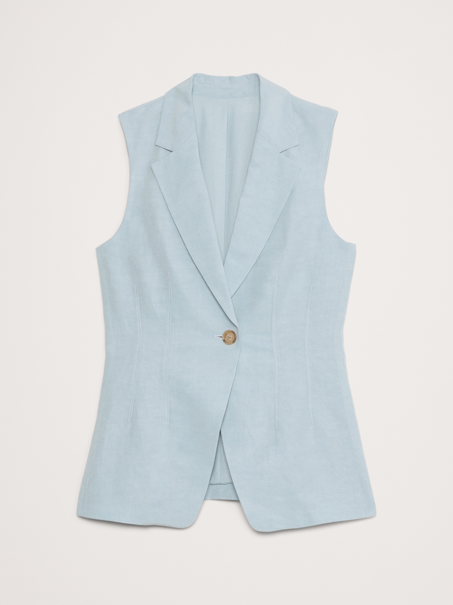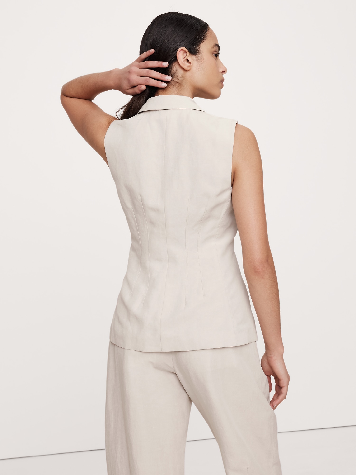 We styled this vest with darts at the back to nip in the waist, crafted in a silky blend of TENCEL™ and linen that’s ready for warm weather. Make it a set with the matching shorts or pants.