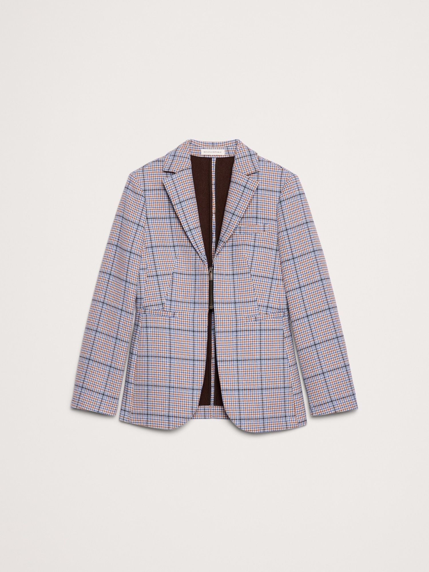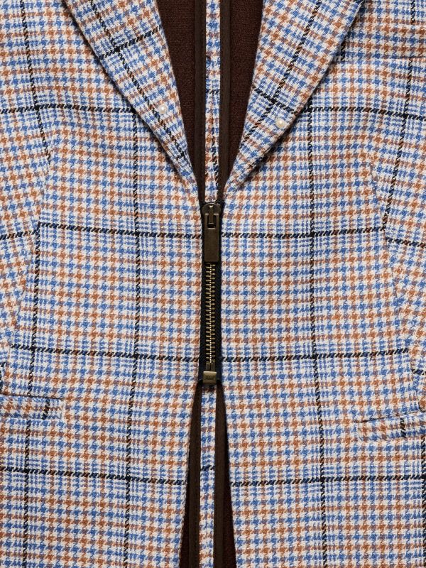 A playful take on a structured blazer, we reached for a beautiful houndstooth plaid fabric from Italy, adding a zip front closure and zips at the cuffs. Leave the cuffs unzipped to let your shirt cuffs peek through.