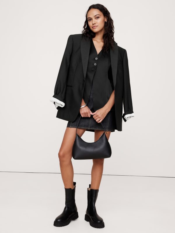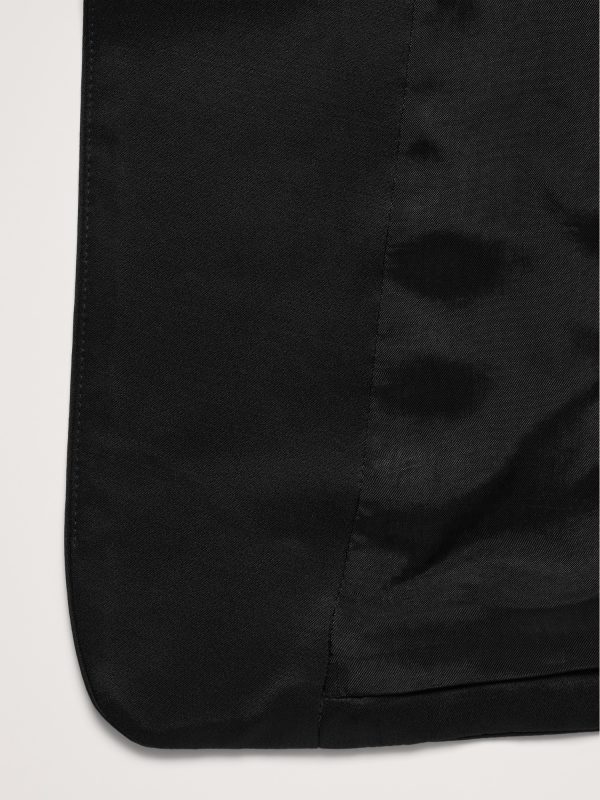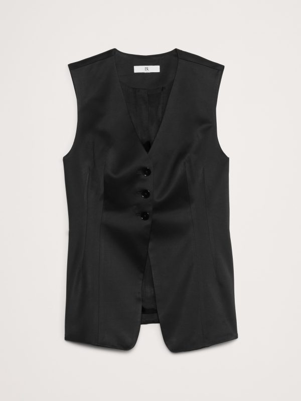 We styled this tailored vest in a longer length with a lapel-free neckline, leaving you to style it layered as a vest or on its own as a top. Here, we reached for an Italian satin fabric with a touch of wool, which adds a touch of warmth and sophistication.