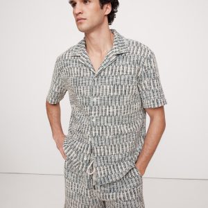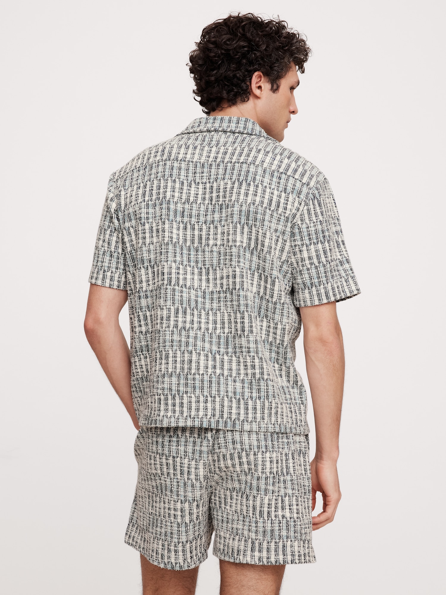 The vibe is vintage. Look closely: this geometric resort shirt has an airy feel and boucle-like texture. Make it a set with the matching shorts.