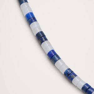 A showcase of the rich natural beauty of moonstone and lapis lazuli beads, flecked with gold.