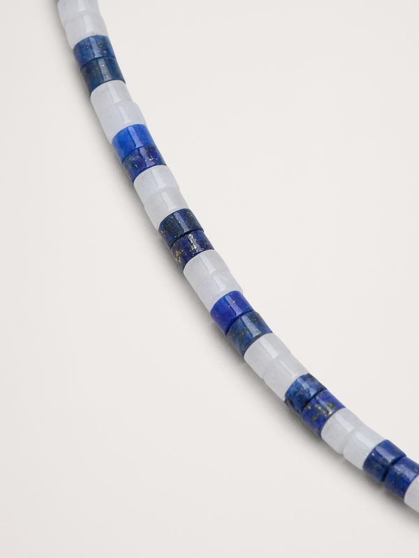 A showcase of the rich natural beauty of moonstone and lapis lazuli beads, flecked with gold.