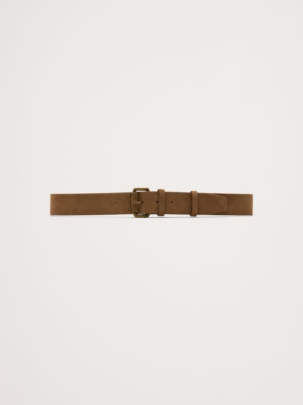 A sturdy and rugged leather belt, with a leather-covered roller buckle accent.