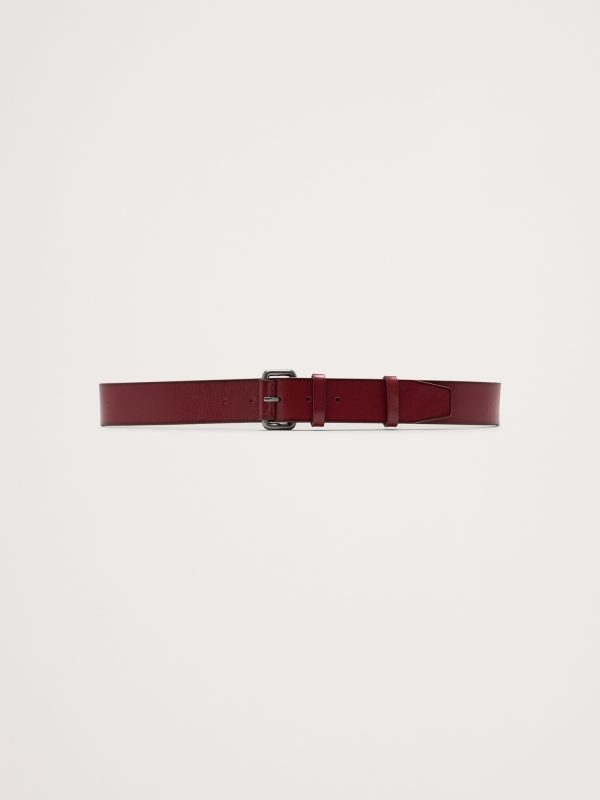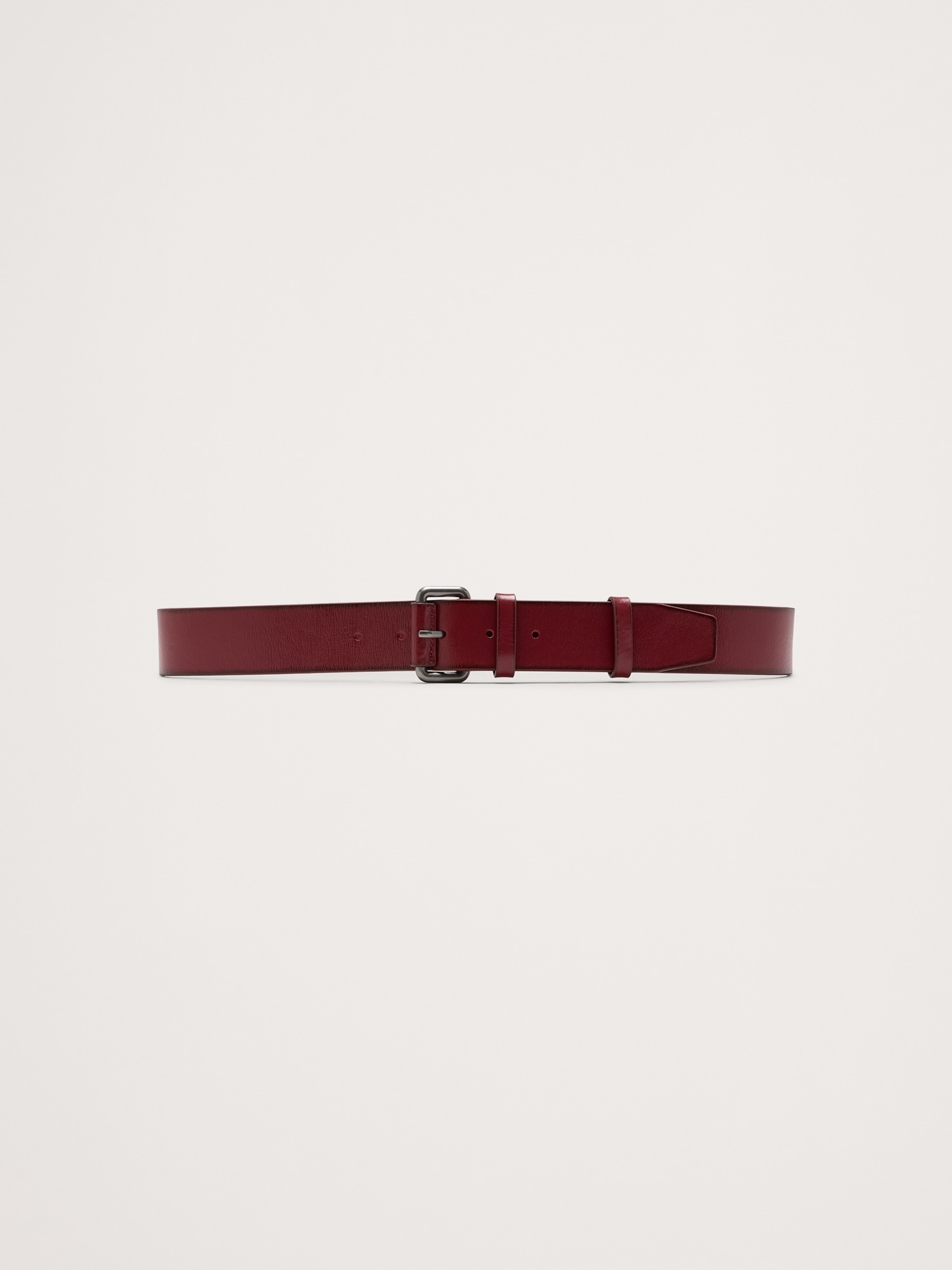 A sturdy and rugged leather belt, with a leather-covered roller buckle accent.