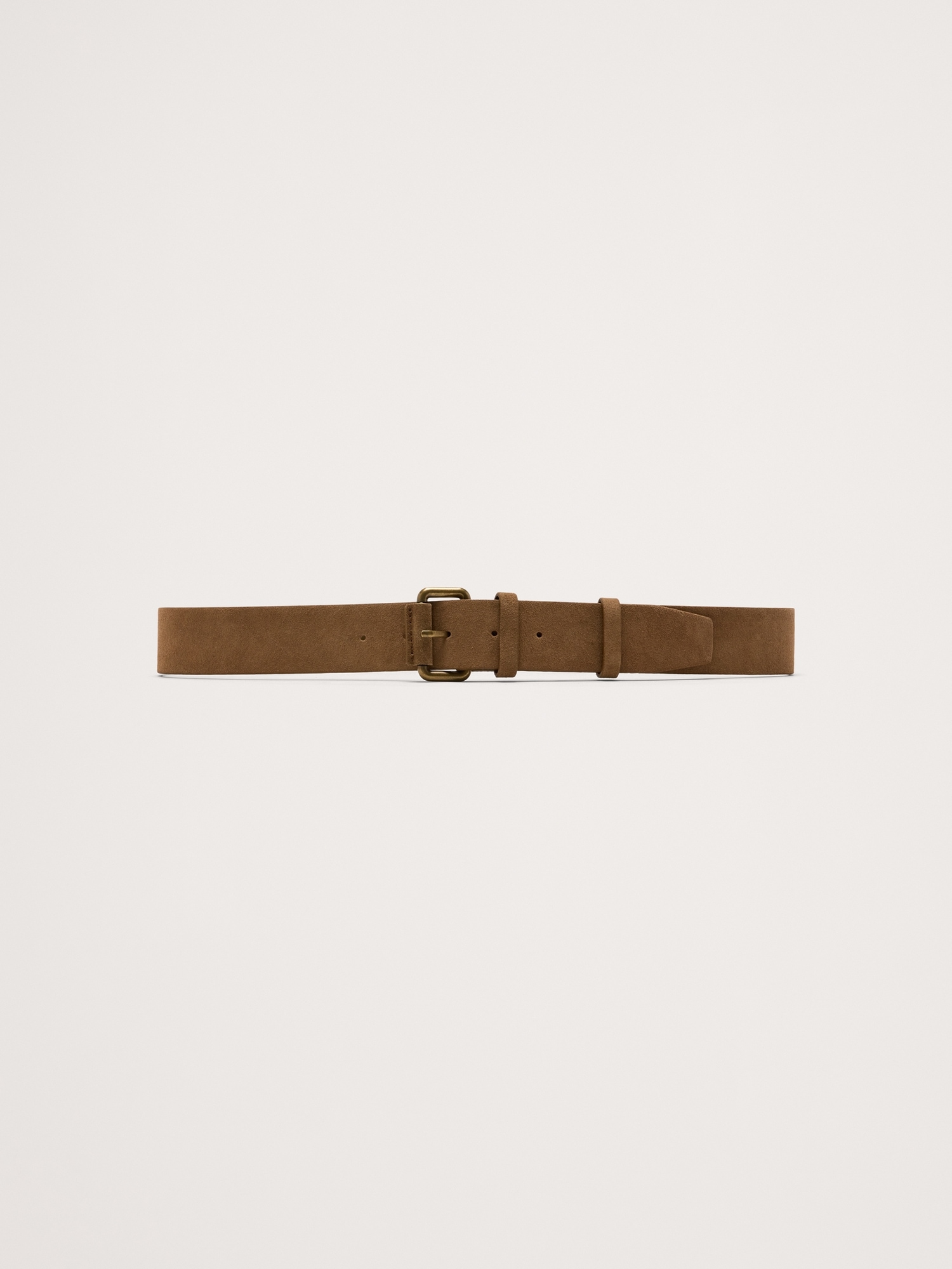 A sturdy and rugged leather belt, with a leather-covered roller buckle accent.