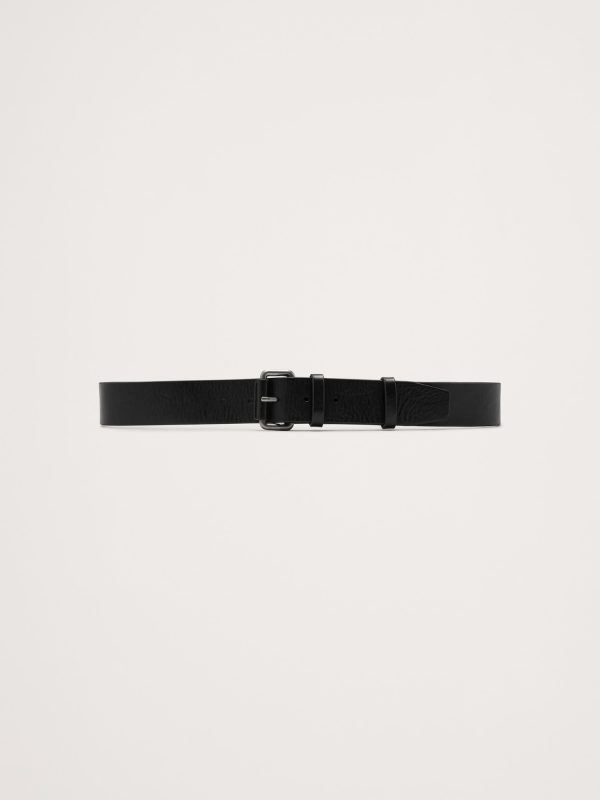 A sturdy and rugged leather belt, with a leather-covered roller buckle accent.